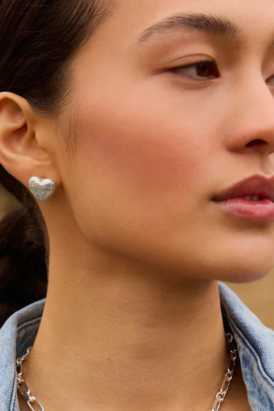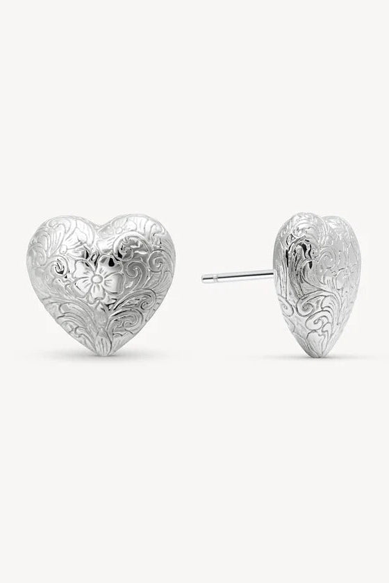 These heart-shaped studs are all about quiet beauty. Made from .925 sterling silver, they feature a softly puffed silhouette etched with delicate scrolling florals—bringing a vintage-inspired finish to your everyday look. At 15mm, they make a subtle statement that feels personal, timeless, and full of texture. Easy to wear and rich in detail, these studs are proof that some of the best statements don’t have to shout.