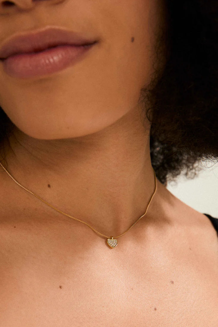 Wear your heart with sparkle! This elegant gold-plated or silver-plated necklace features a petite heart pendant adorned with dazzling Preciosa crystals, adding a touch of romance and sophistication to your look. Ideal for everyday wear or special occasions, providing just the right amount of shine. Wear it solo for an understated statement or layer with other chains for a trendy look. The perfect go-to piece for any occasion! Measuring 40 cm with a 9 cm extension chain, this necklace is crafted from 97% recycled materials, with love for our planet.