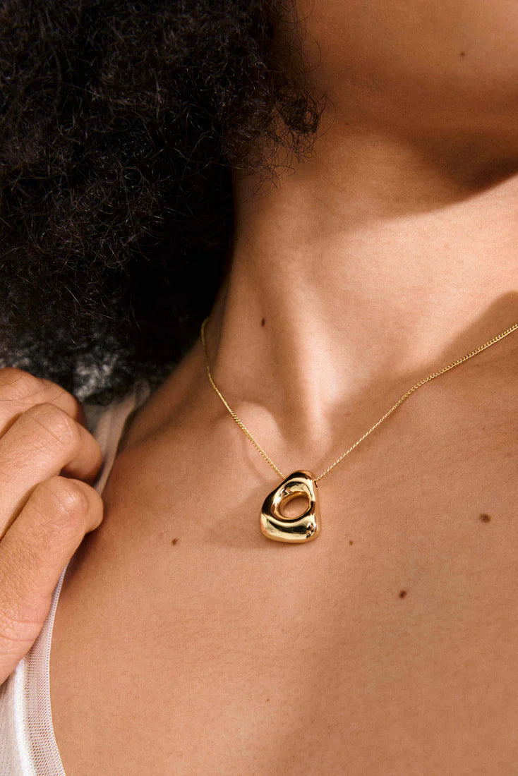 Free to express, free to be you! Give your look a unique natural feel with the gold-plated or silver-plated FREE necklace from Pilgrim. A slender chain with a sculptural pendant inspired by the raw beauty of nature, ocean waves and stones shaped by the tide's forces. With its shiny finish and talismanic vibe reminiscent of a hagstone from the beach's treasure trove, this pendant becomes your new go-to accessory, adding a touch of mystery and personality to your outfit. Pair with a chunky knit jumper and your favourite boots for an effortless autumn look. This necklace measures 38 cm + 9 cm extension chain and is crafted from 99% recycled material, with care for the environment.