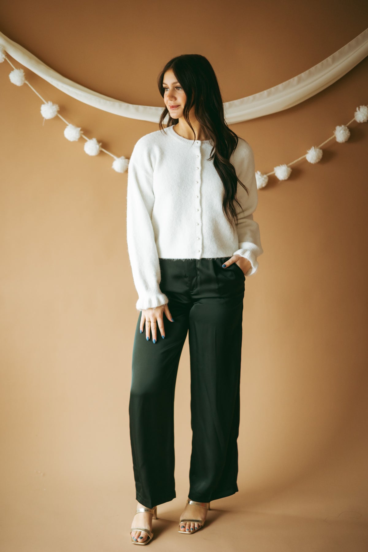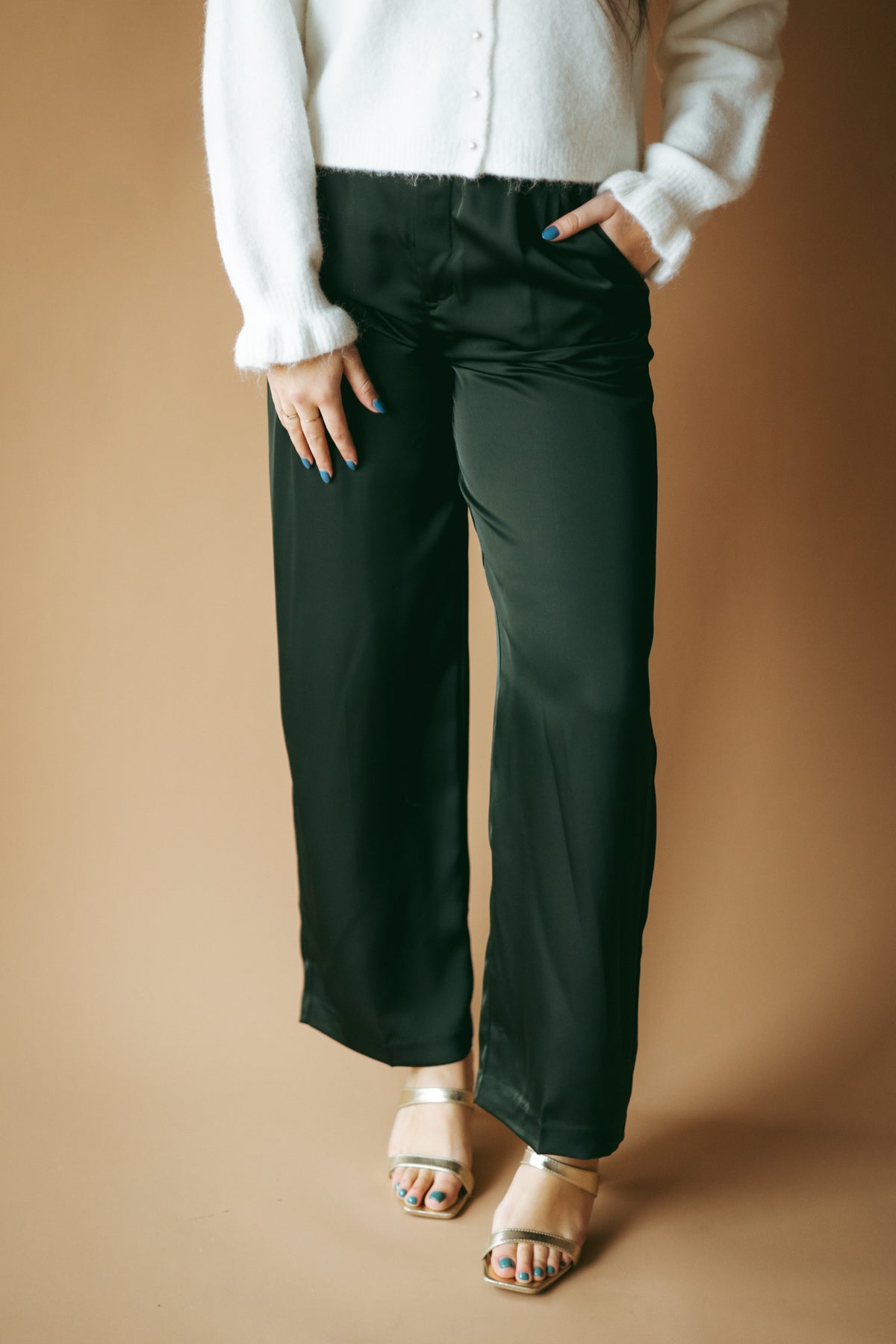 The Isolde Satin Pant in Garland Green combines a fluid silhouette with an easy, elevated feel. Designed with a high, gathered waistband, these wide-leg pants offer comfort without sacrificing style. The satin finish spotlight the deep green shade, giving the look a touch of understated elegance. Whether styled with heels for an evening out or paired with a sneakers for a casual day, these pants move effortlessly through any occasion.