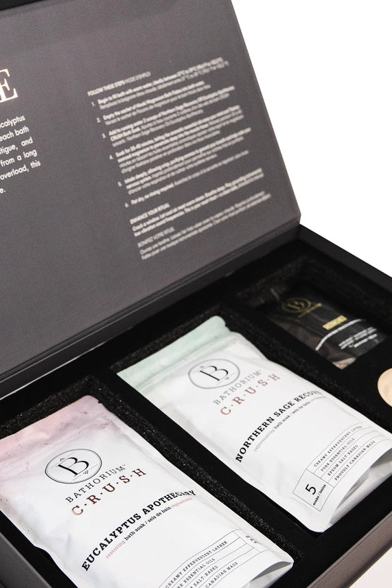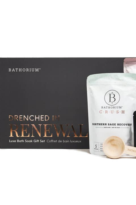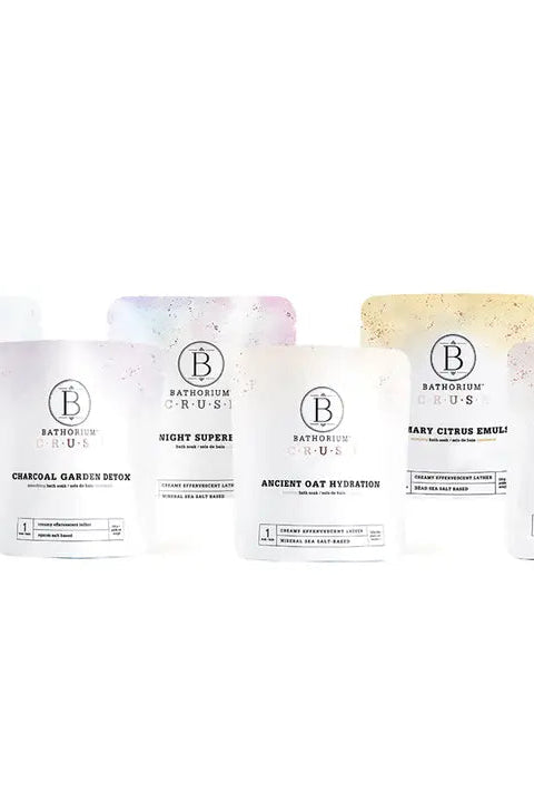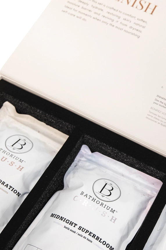 Step into a new state of being with this invigorating set designed to restore, reset, and recharge in the comfort of your bath. Featuring three of our magnesium-rich bath soaks and our signature Bathorium™ Scoop, this collection delivers a multi-sensory bath ritual that clears the mind and helps soothe sore joints and muscles.