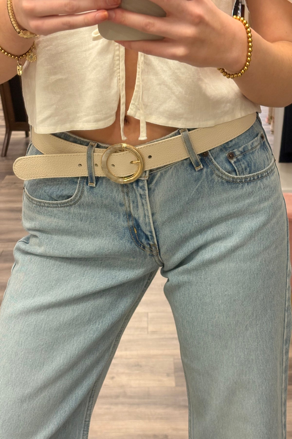 Regular price $137.00The Julita belt features a round mixed-media buckle with a tortoise shell or marbled resin inlay. Handcrafted with our Italian Pebbled Nappa leather.