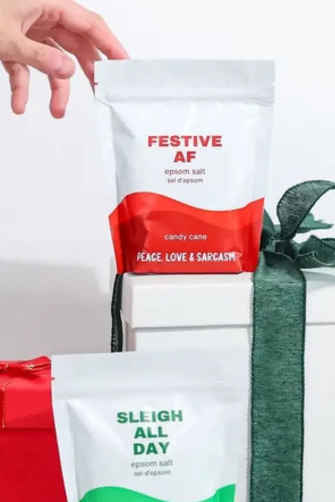 Experience a fun and snarky bath soak with Festive AF Epsom Salts! Relax and indulge in some serious self care with these festive salts. Perfect for adding an extra touch of fun to your bath time routine. Trust in the power of epsom salt for pure relaxation.