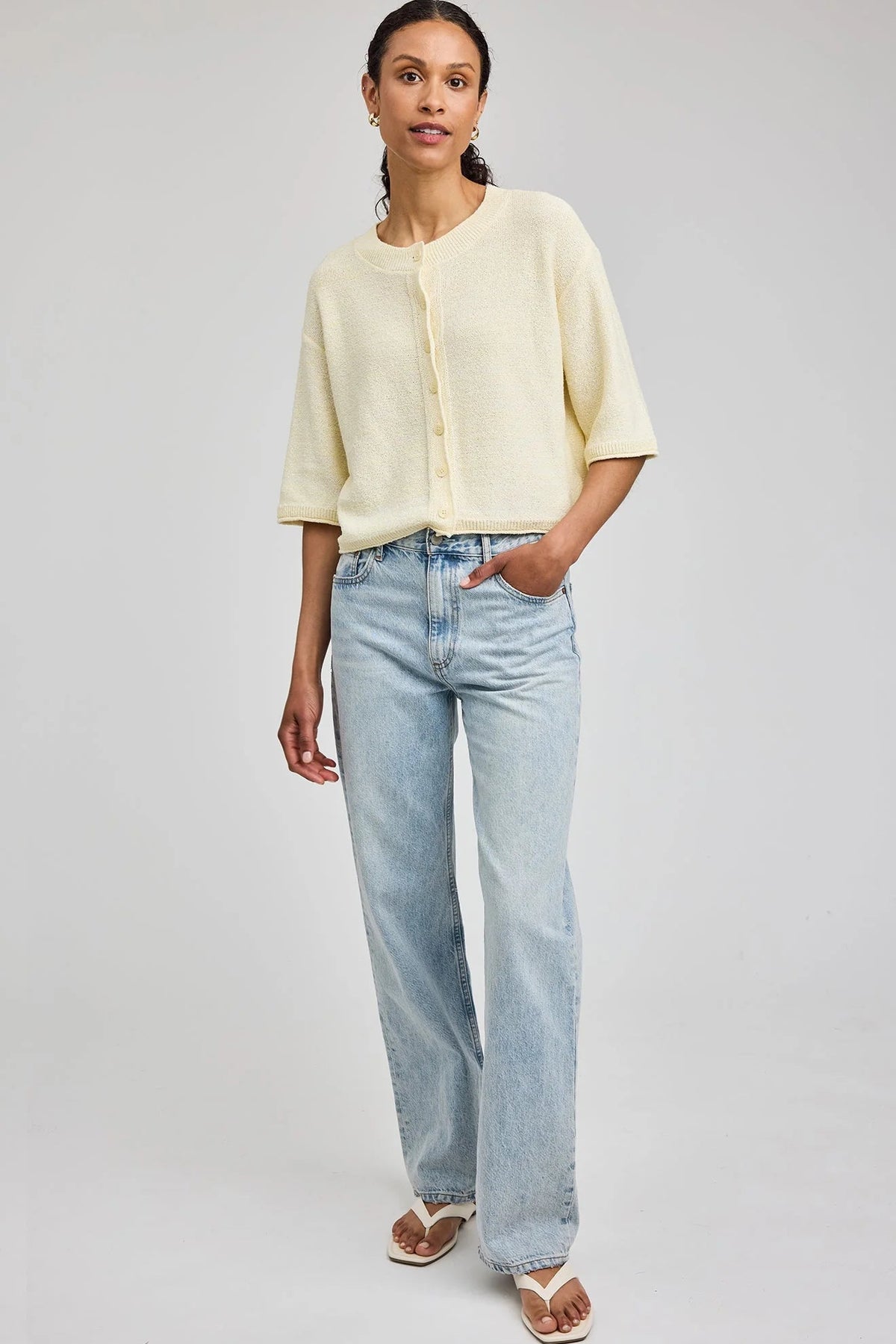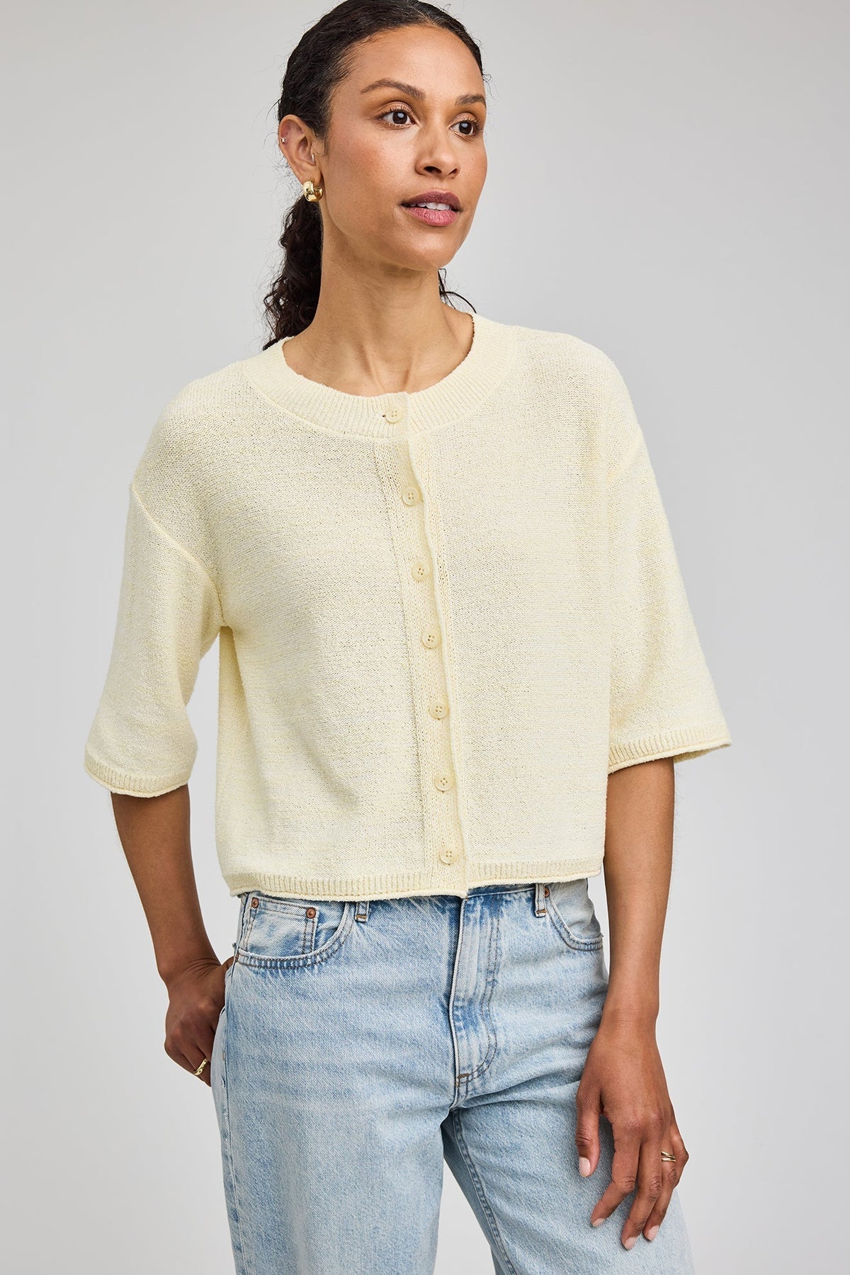 Regular price $98.00The Genevieve cardigan is made of a cotton blend yarn with a slub effect in a reverse jersey stitch. Features include a front button closure and rolled hem details.