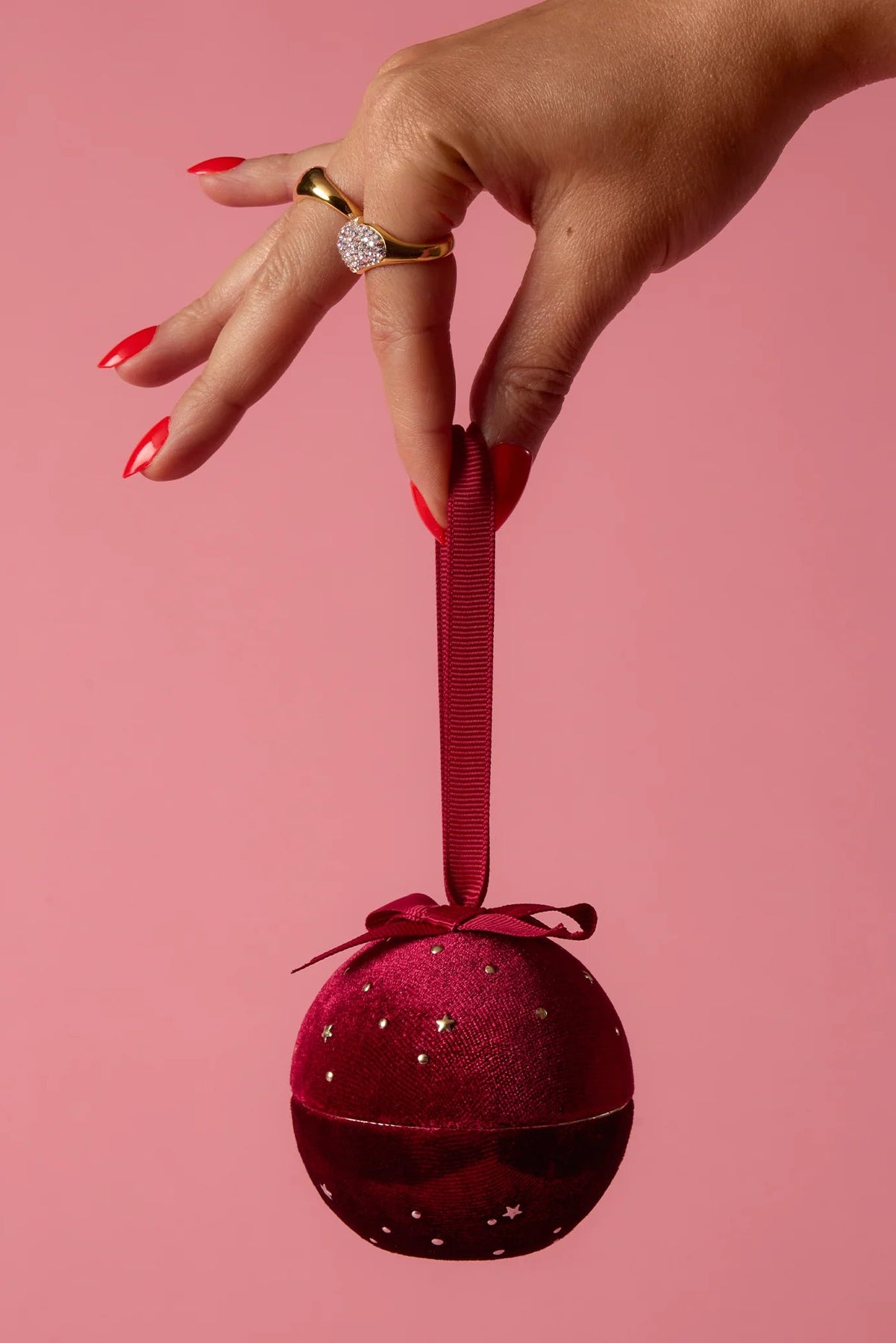 Put the gift on the tree instead of under it. Intended for smaller pieces like rings and studs, this velvet ornament-shaped case features celestial details and a ribbon bow for easy hanging. A work of art on the outside with a surprise on the inside.