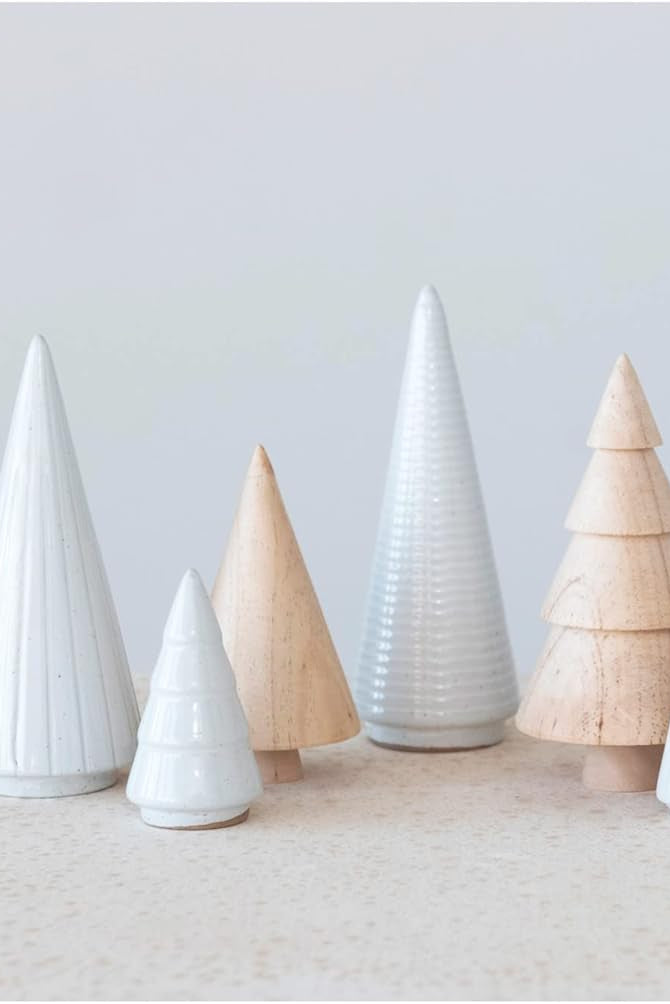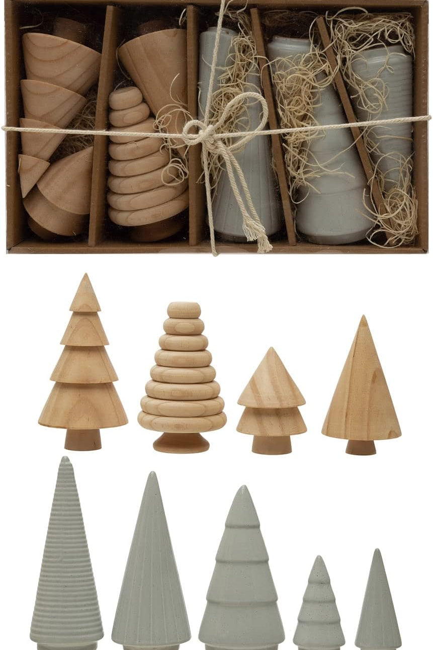 Pine Wood and Stoneware Trees, Natural and White Boxed Set