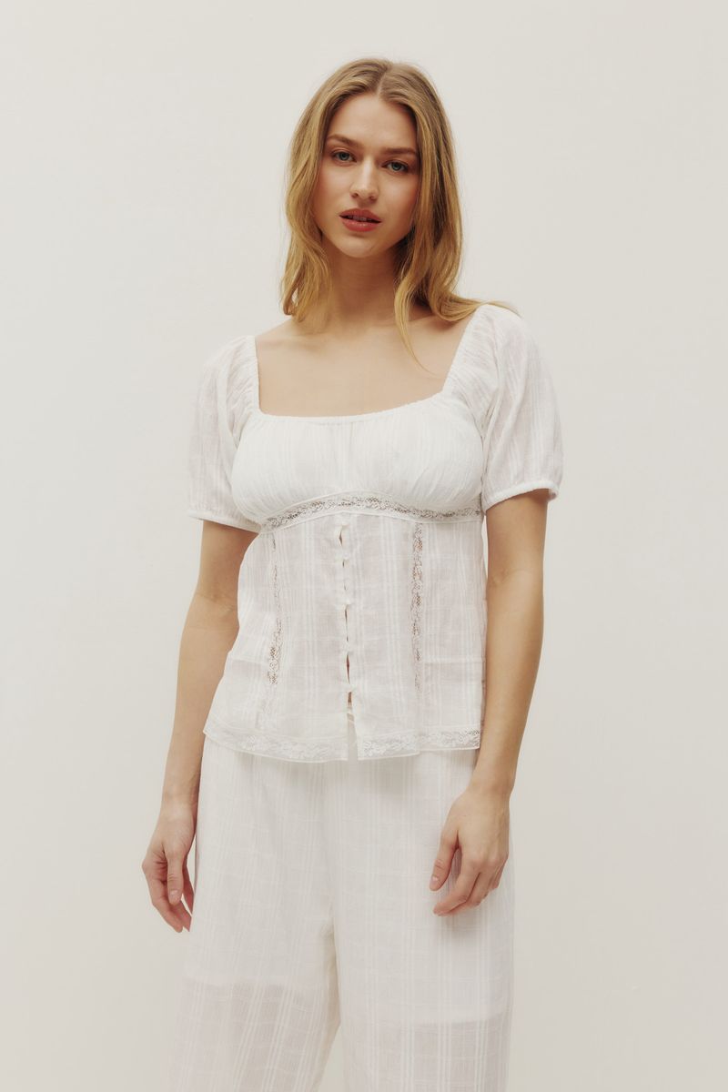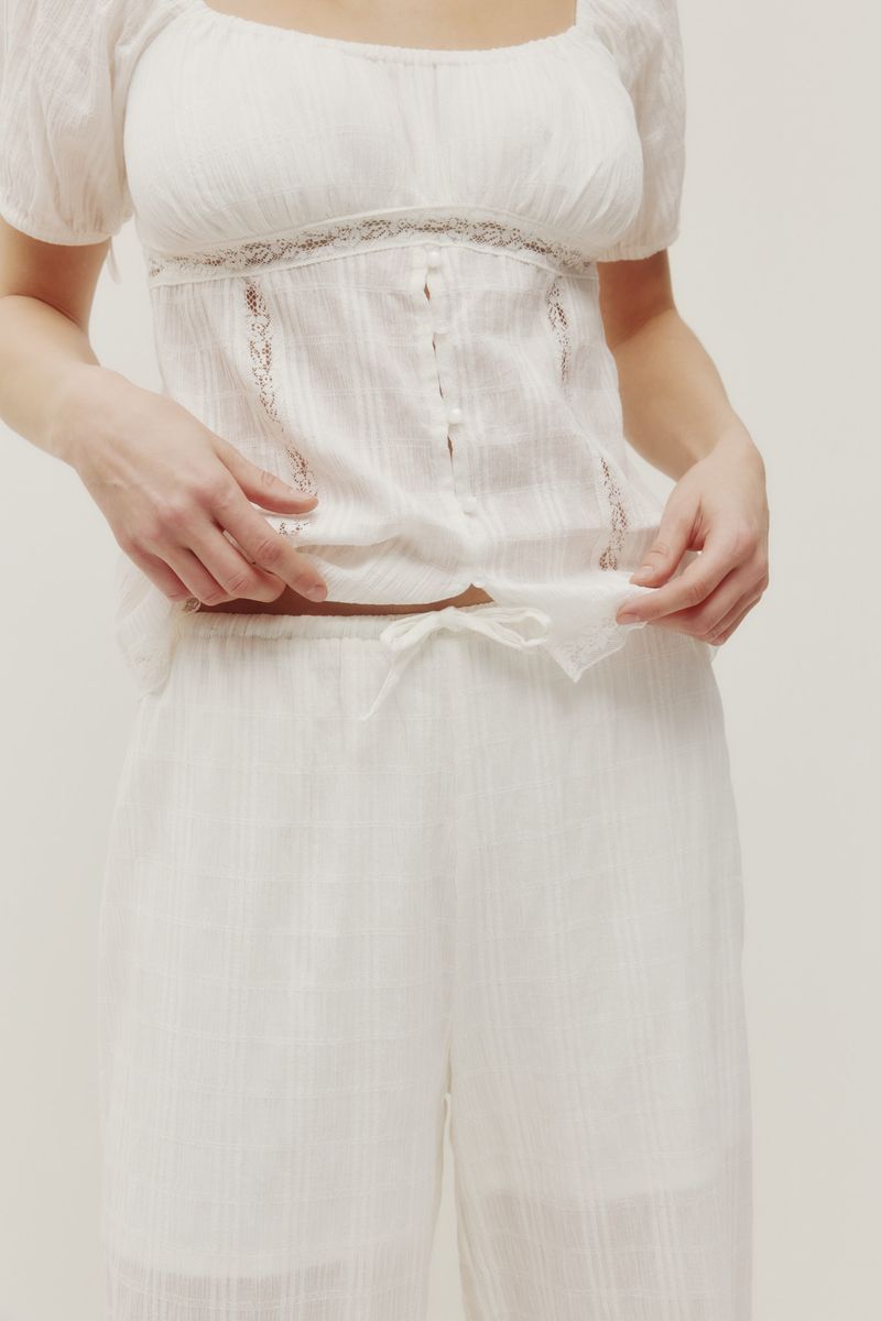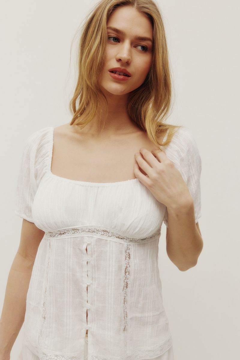 Regular price $88.00The Rhea top is made of a cotton fabric with an embroidered eyelet design and is fully lined. Features include a v-neckline and front tie closure. Complete the look with the Elodie skirt.