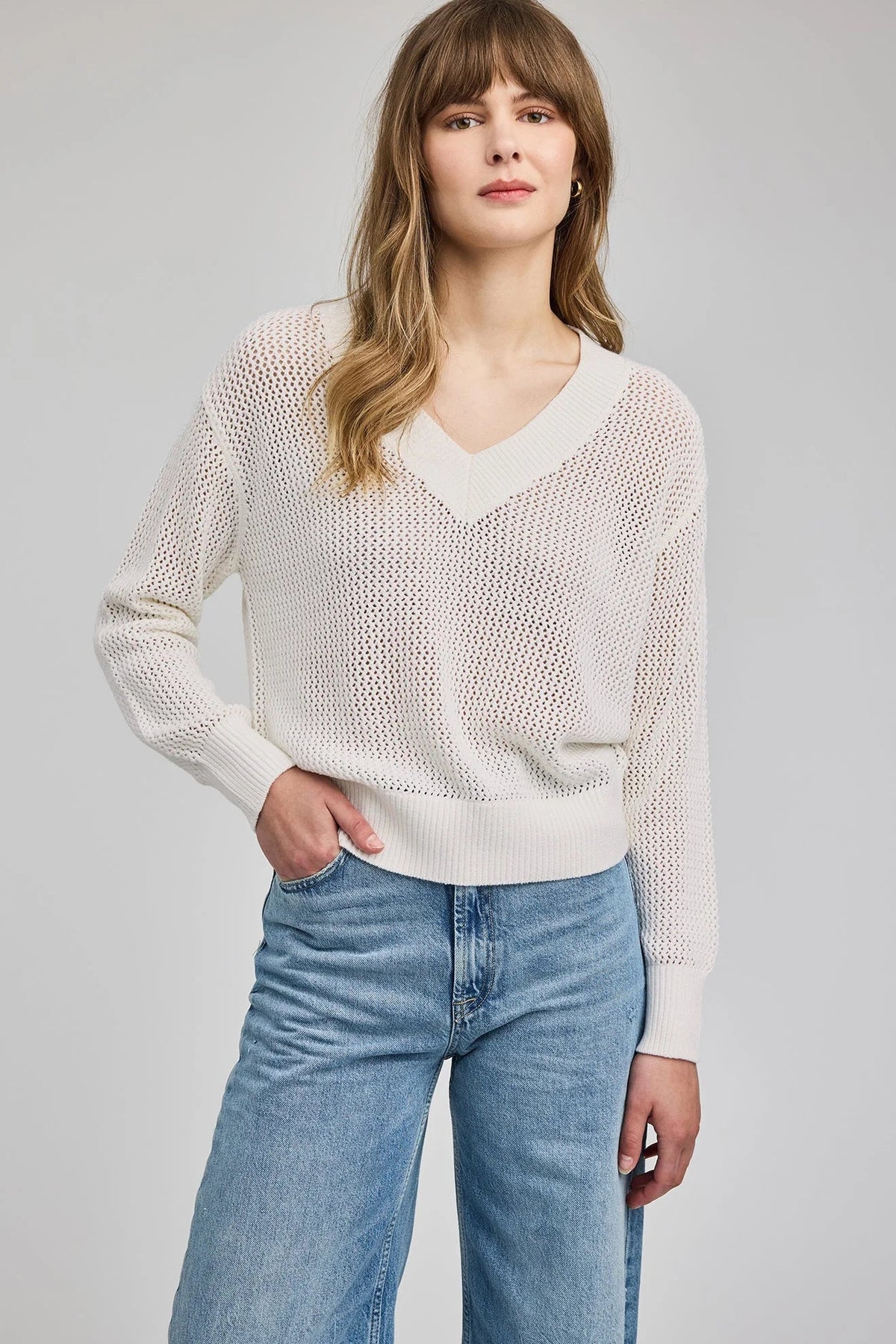 Regular price $124.00The Jensen sweater is made of a soft yarn in an open knit pattern. Features include a wide rib v-neckline and a relaxed fit for an effortless feel.