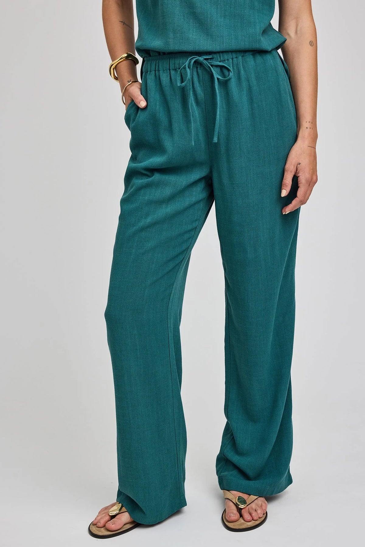 The Finley pant is made of a linen blend fabric for an effortless look and feel. Features include slash pockets and an elasticated waistband with adjustable drawcord. Complete the look with the Vera tank or Portia button-down.