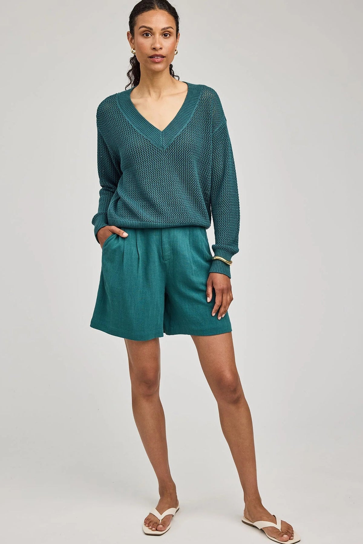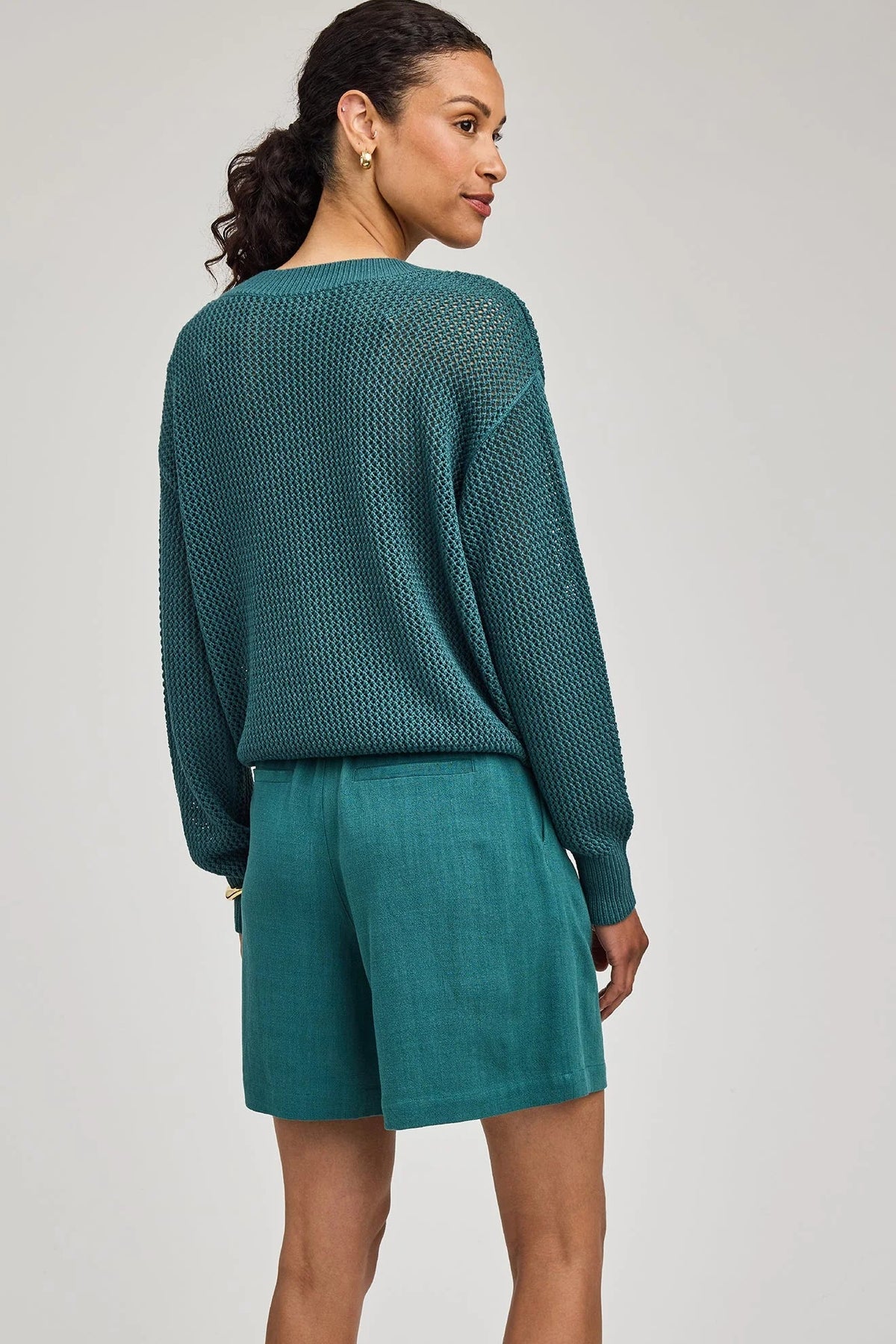 The Portia button-down is made of a linen blend for an effortless look and feel. Wear it as is or worn open with the Alma short or Finley pant.