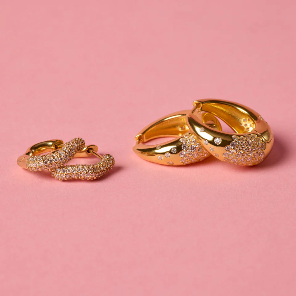 These 16mm reversible hoops deliver double the impact with half the effort. One side features our custom Champagne Sparkle—golden, luminous, and undeniably striking. Flip them over to reveal polished metal etched with radiant crystal starbursts. Lightweight and easy to wear, these hoops offer two elevated looks in one silhouette. Whether you’re dressing for golden hour or a starlit night, these earrings are ready to rise to the occasion.