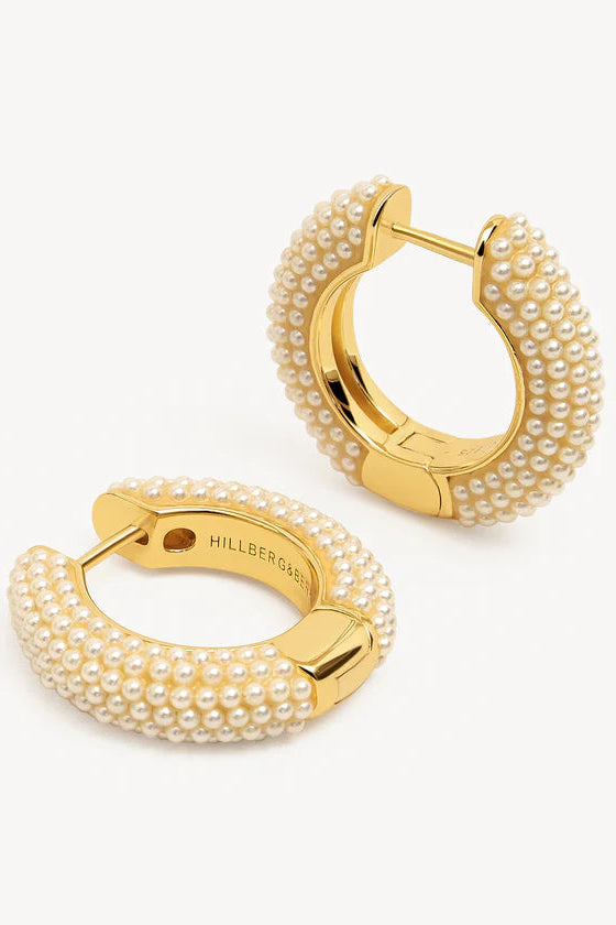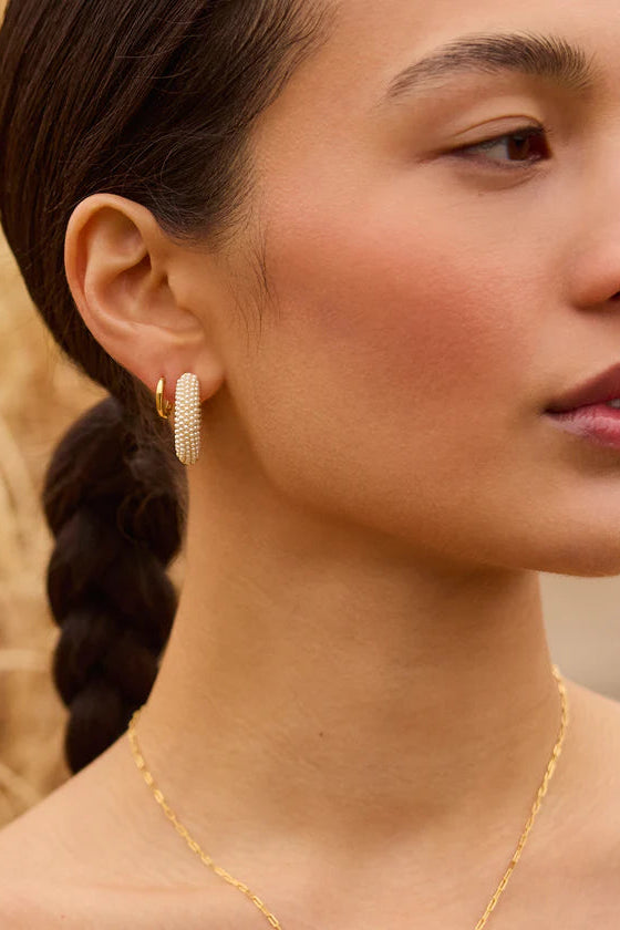 A modern take on pearls, these 25mm hoops are lined with creamy pearls, hand-set in warm 14k gold-plated sterling silver. The textured arrangement gives them a dimensional, organic feel, while the sleek hoop silhouette keeps them effortlessly wearable. Finished with a secure hinge click closure for all-day comfort, these earrings bring vintage charm into a contemporary space.