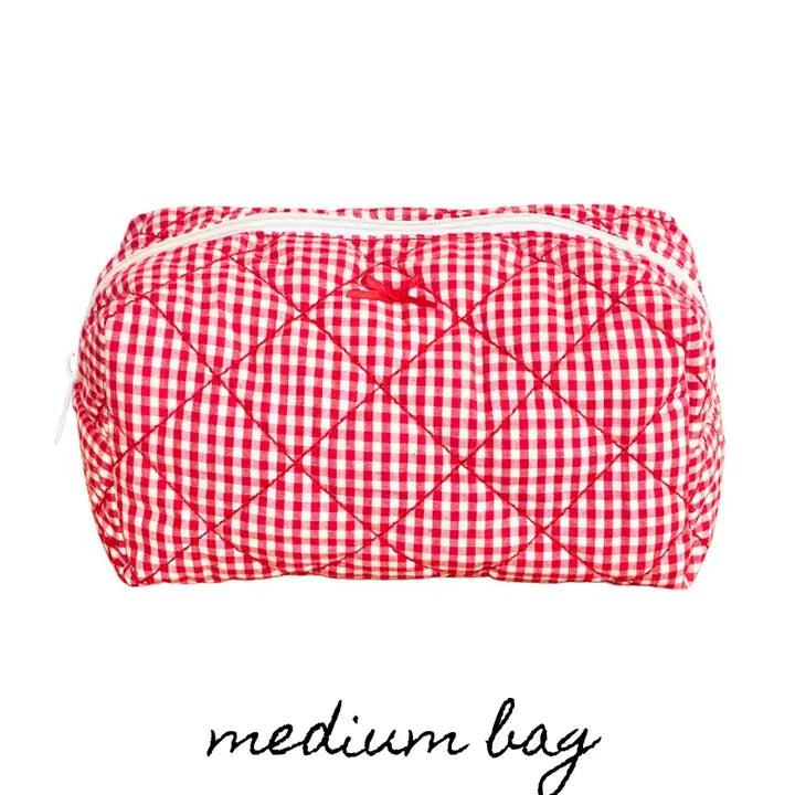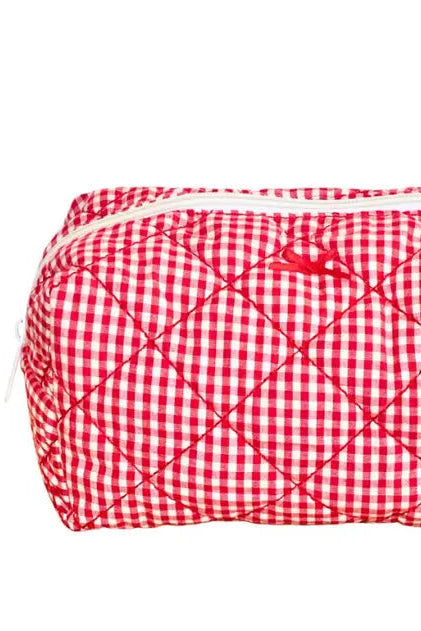 Regular price $30.00This quilted cosmetic bag has a red wipeable fabric in the interior to easily clean. The exterior is a red gingham cotton fabric and is completely machine washable!