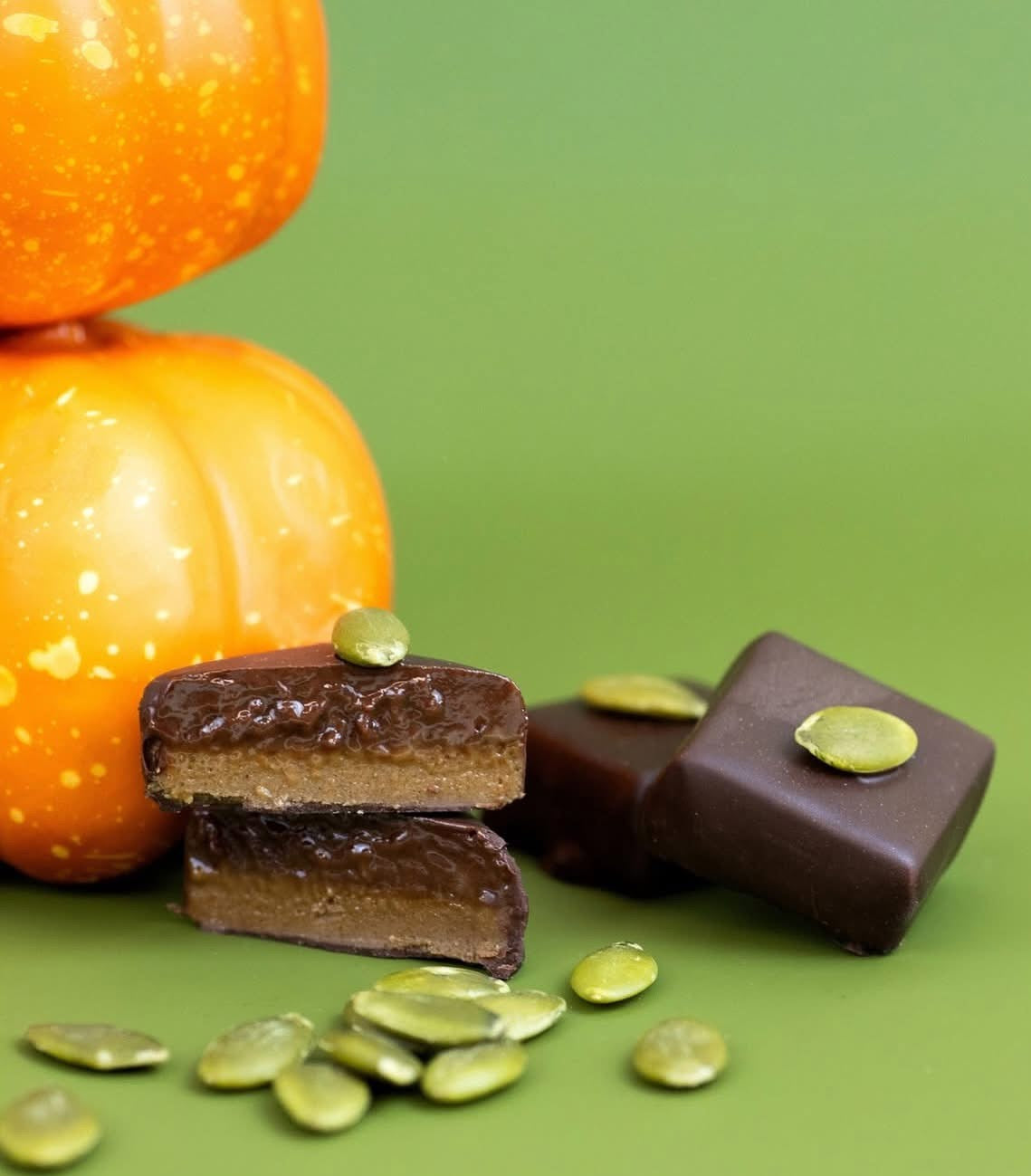 Pumpkin Seed Praline: A two-tone masterpiece of silky milk chocolate over cinnamon-spiced pumpkin seed ganache enrobed in dark chocolate.