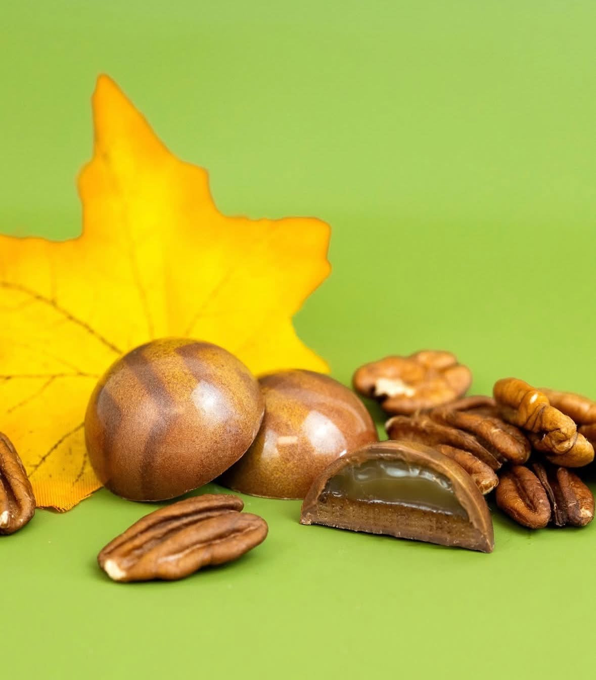 Pecan & Maple Caramel: Nutty pecan laced gianduja topped with a maple caramel in a creamy milk chocolate shell.