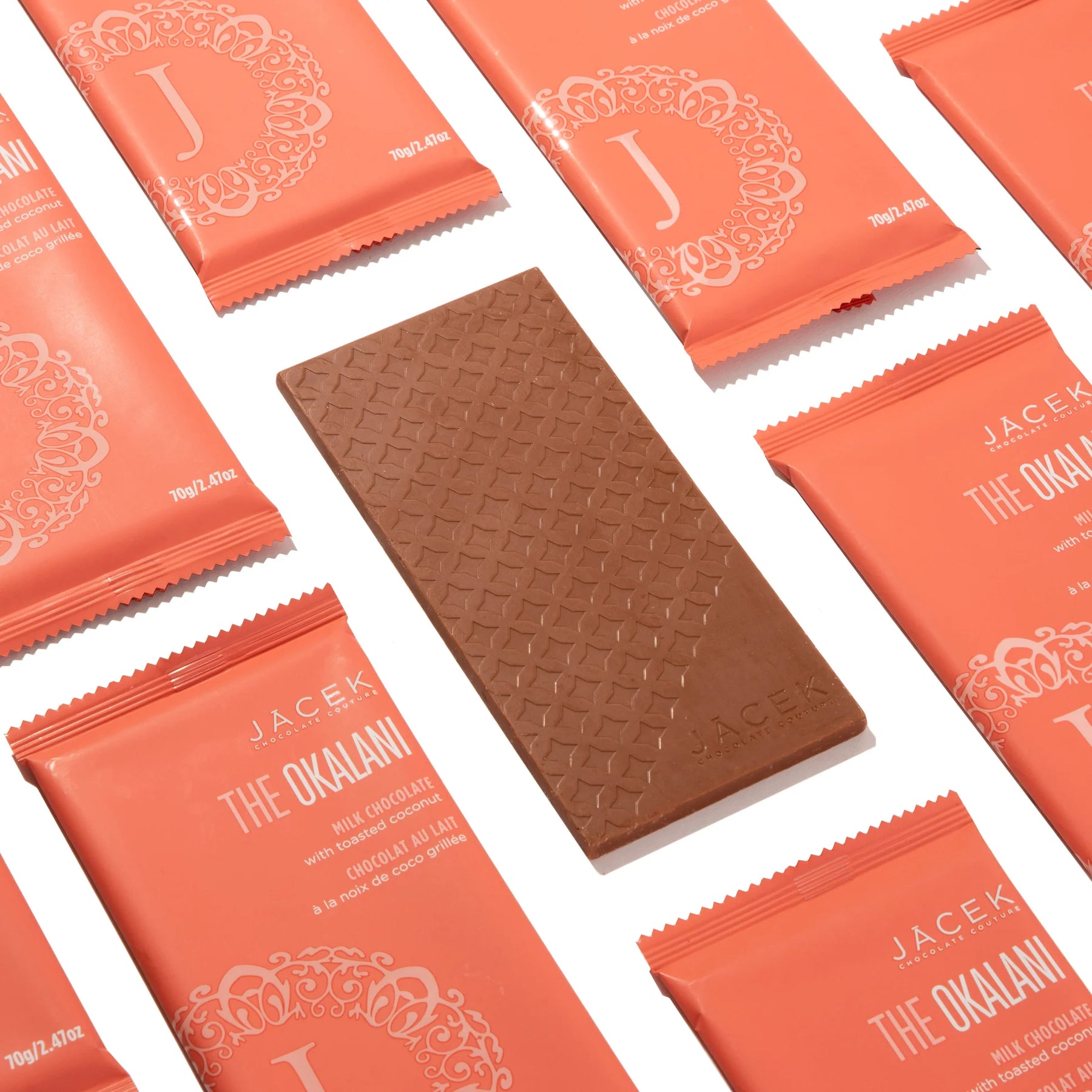 The Okalani pays homage to the effortless beauty of a beachy floral dress. Like the ease of donning an airy gown, this milk chocolate bar invites you to enjoy the mellow & easy-going flavours of toasted coconut.