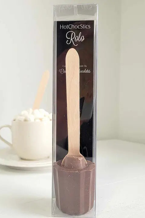 The Rolo HotChocStic is a combination of our Creamy Milk Chocolate and a hot cocoa mix. Topped with a Mini Rolo to make it an extra special treat. Stir them into a steaming cup of milk to make a delicious cup of hot chocolate. 1 serving.