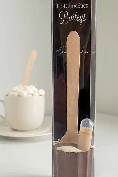 The Rum Chata HotChocStic is a combination of white chocolate and hot cocoa mix topped with cinnamon and a pipette of Rum Chata. Stir them into a steaming cup of milk to make a delicious cup of hot chocolate enjoyable for the adults. Serves 1. No Liquor License is required to sell these tasty treats!
