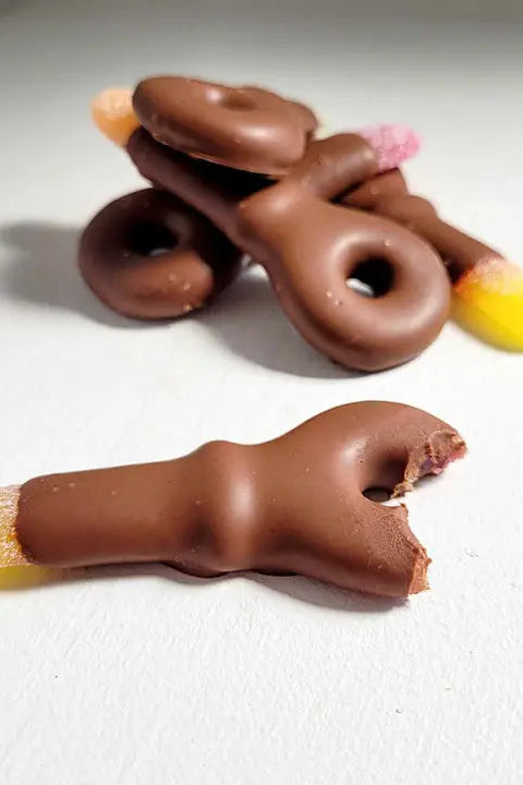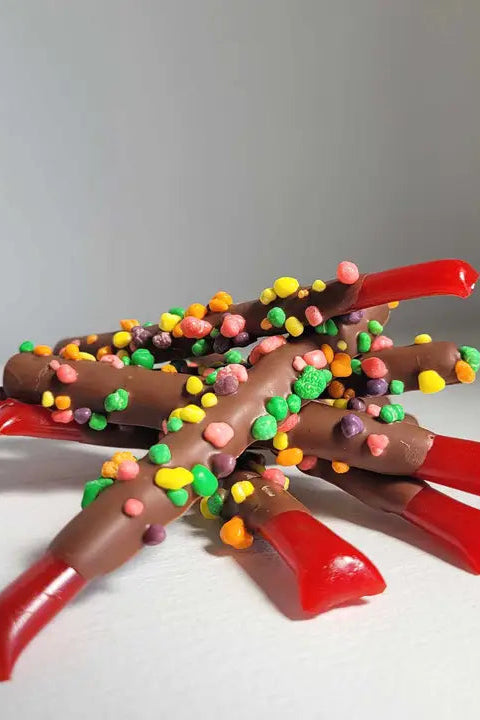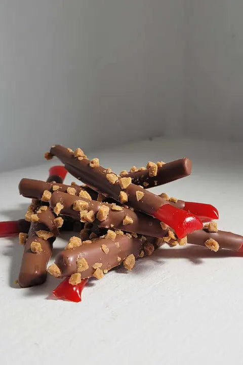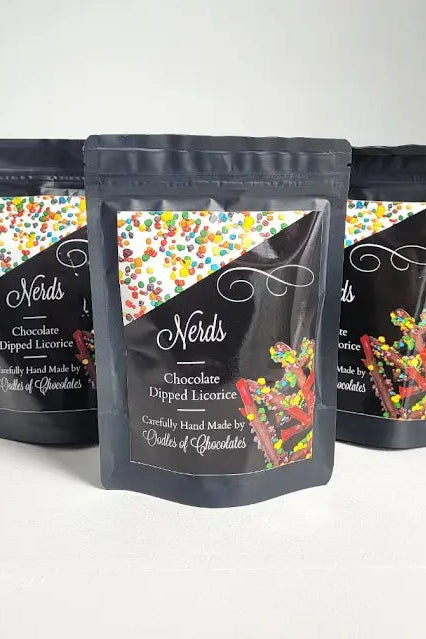 Who could have guessed that Nib's Licorice would taste soooo good dipped in our delicious Milk Chocolate? Then add a sprinkle of crunchy Nerds....what a delicious combination! Definitely a fan favourite. 8 Pieces per package.