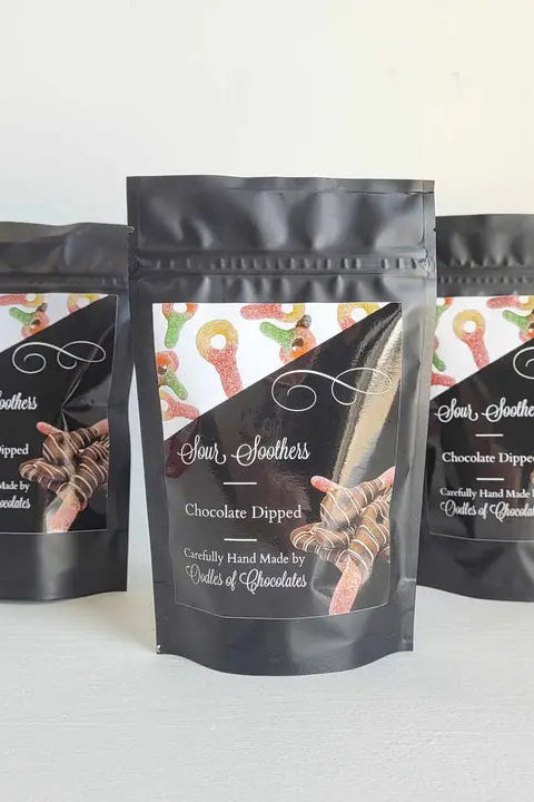 Tangy Sour Soothers are dipped into our creamy Milk Chocolate. A little bit of Sour and a little bit of Sweet for that perfect taste combination. Definitely a customer favorite. 5 Pieces per package.