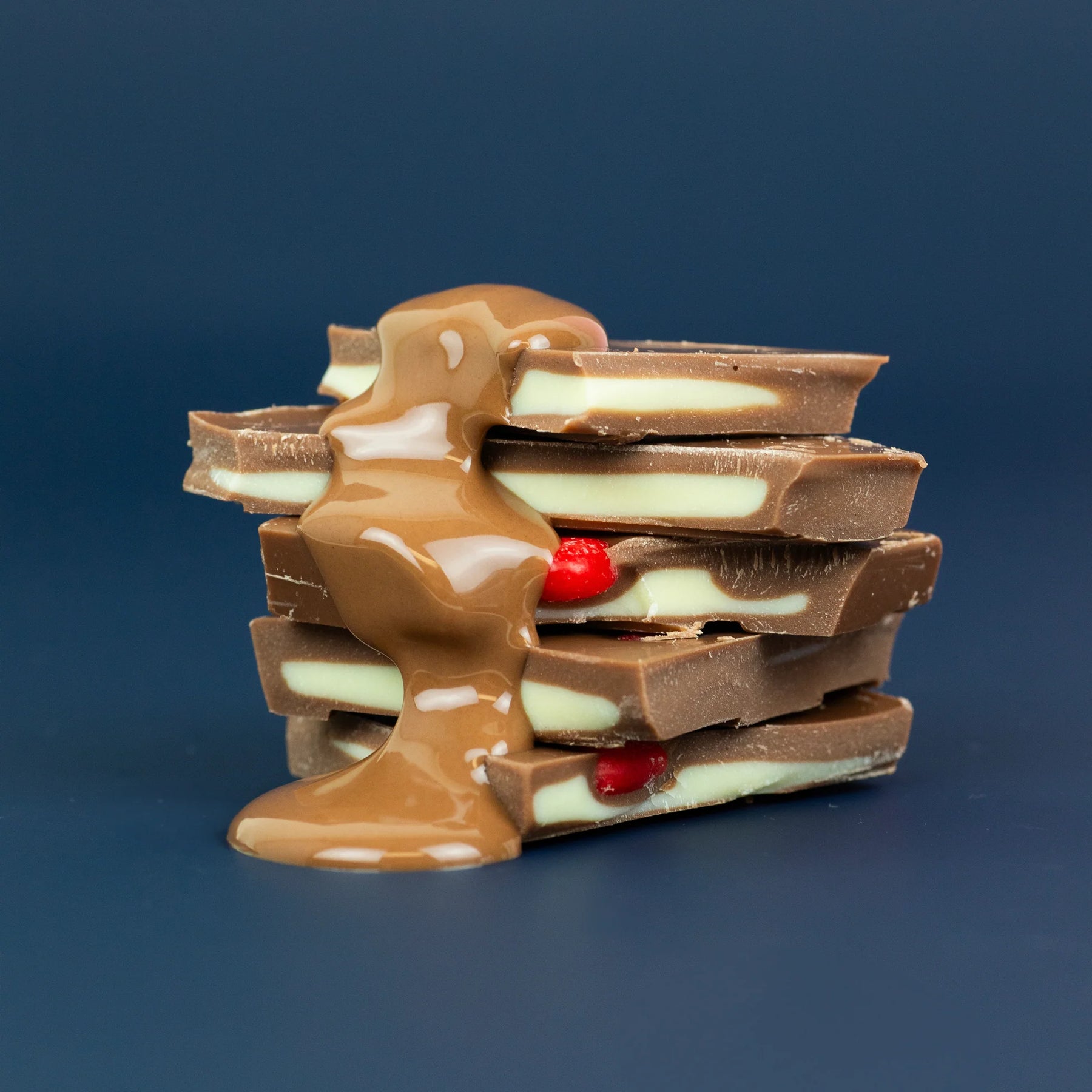 Chocolate toffee with layers of dark, white, and Ruby chocolate swirls topped with strawberries. This flavour is so delicious!