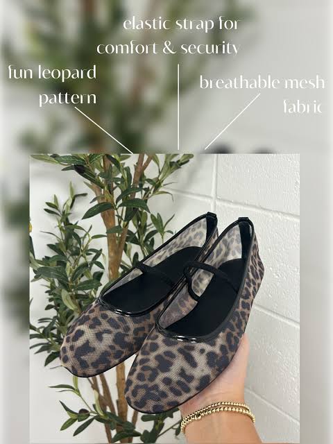 Step out with flair in the Gaelle Leopard Mesh Ballet Flat. Crafted with a airy mesh upper adorned with a striking leopard print and finished with a stylish black strap, these flats blend comfort and fun effortlessly. Designed to keep you feeling light and secure, they’re the perfect wild twist to brighten up any look. Add a dash of playful elegance to your shoe lineup with these must-have flats.