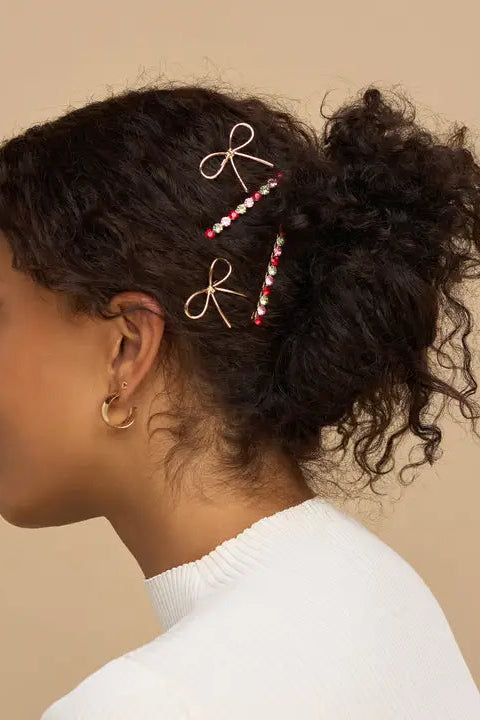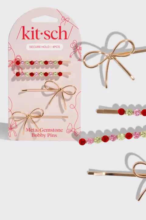 The Kitsch Metal Gemstone and Bow Bobby Pins 4pc Set – Red, Pink & Green is your new go-to for effortless charm. Featuring a mix of whimsical bows and gem-studded pins in bold, playful hues, this set lets you mix, match, and style your strands your way. Whether you're pinning back bangs, securing layers, or taming flyaways, these high-shine metal pins offer a gentle, secure hold—no slipping, no snagging.