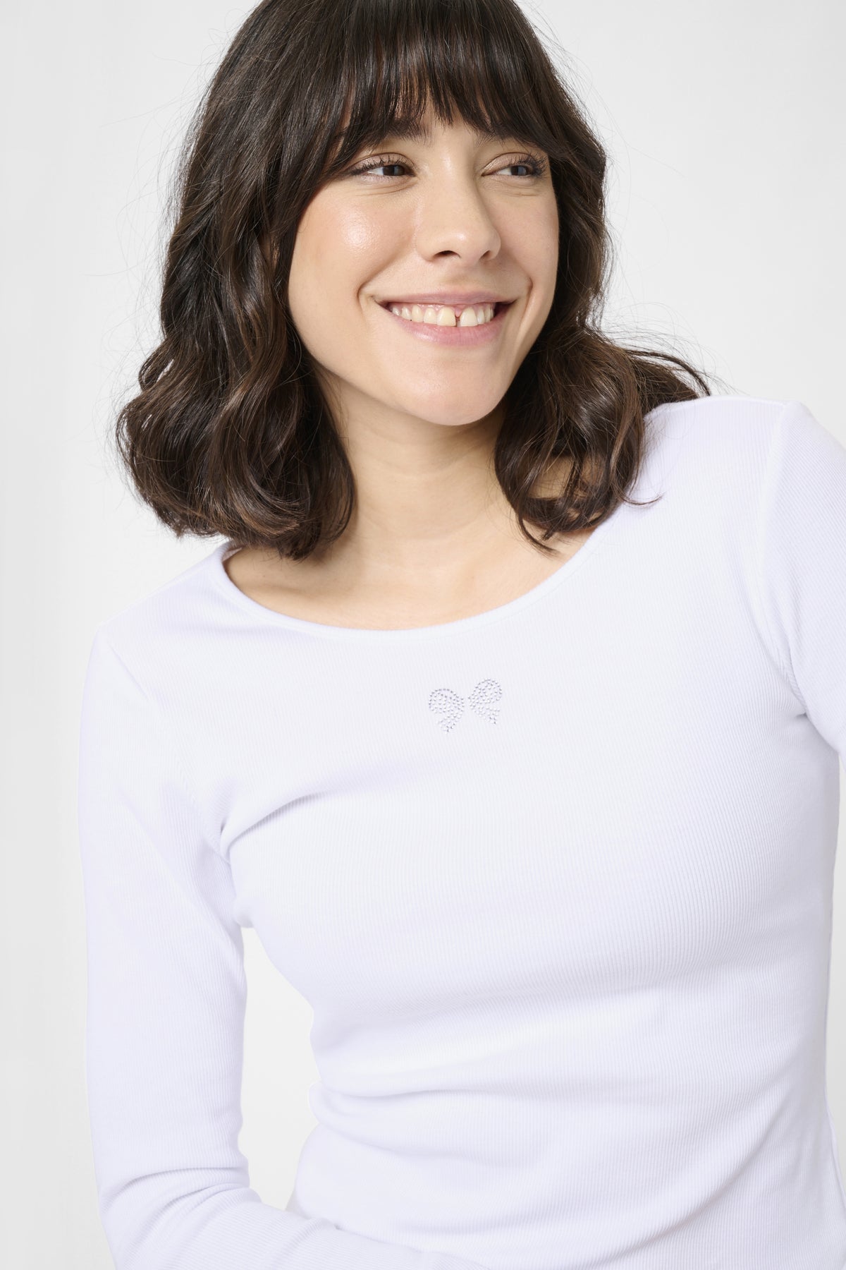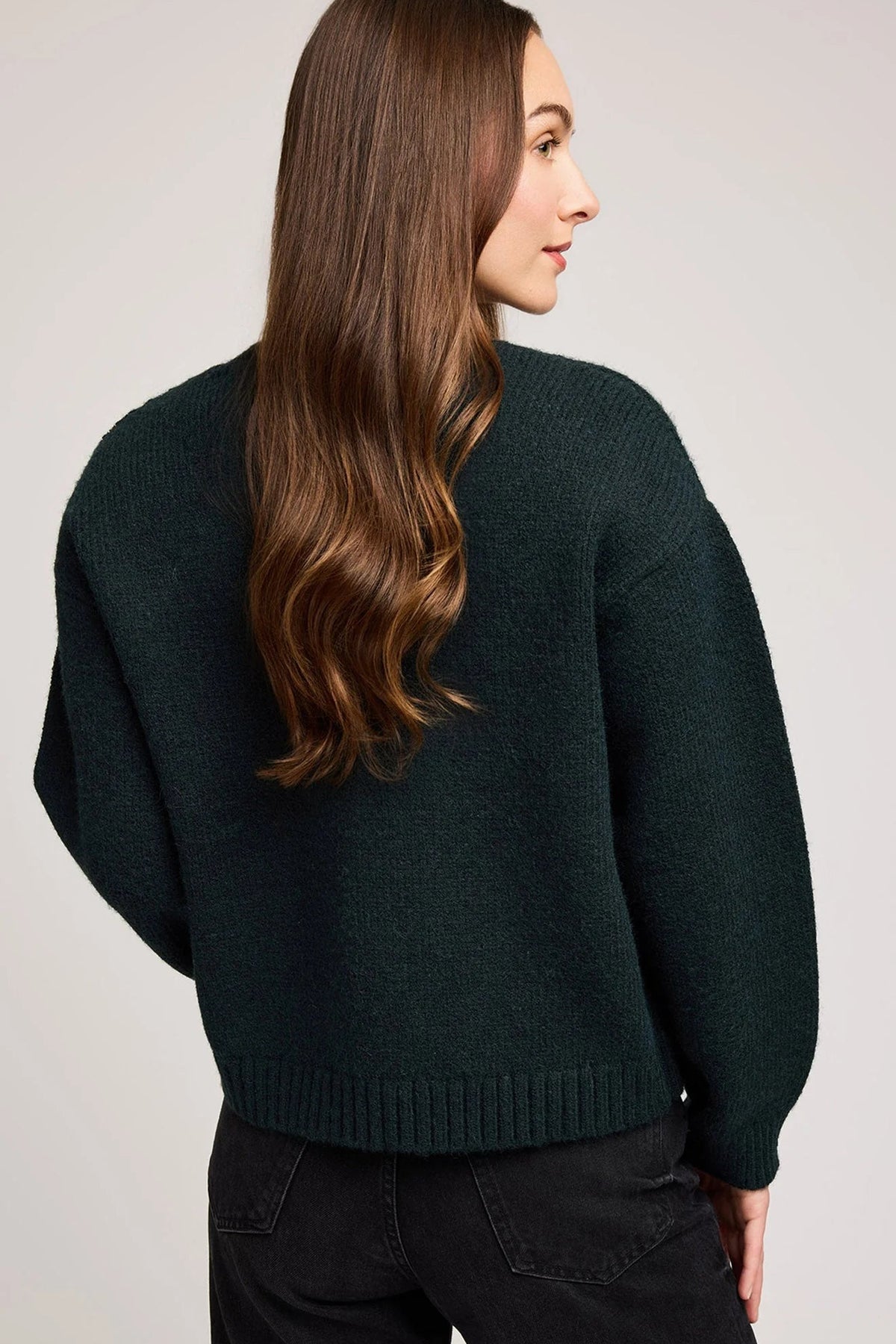 Sweater with a straight silhouette, soft finish, classic crew neckline with subtle embellishment. Features relaxed gathered sleeves and ribbed cuffs for understated style.