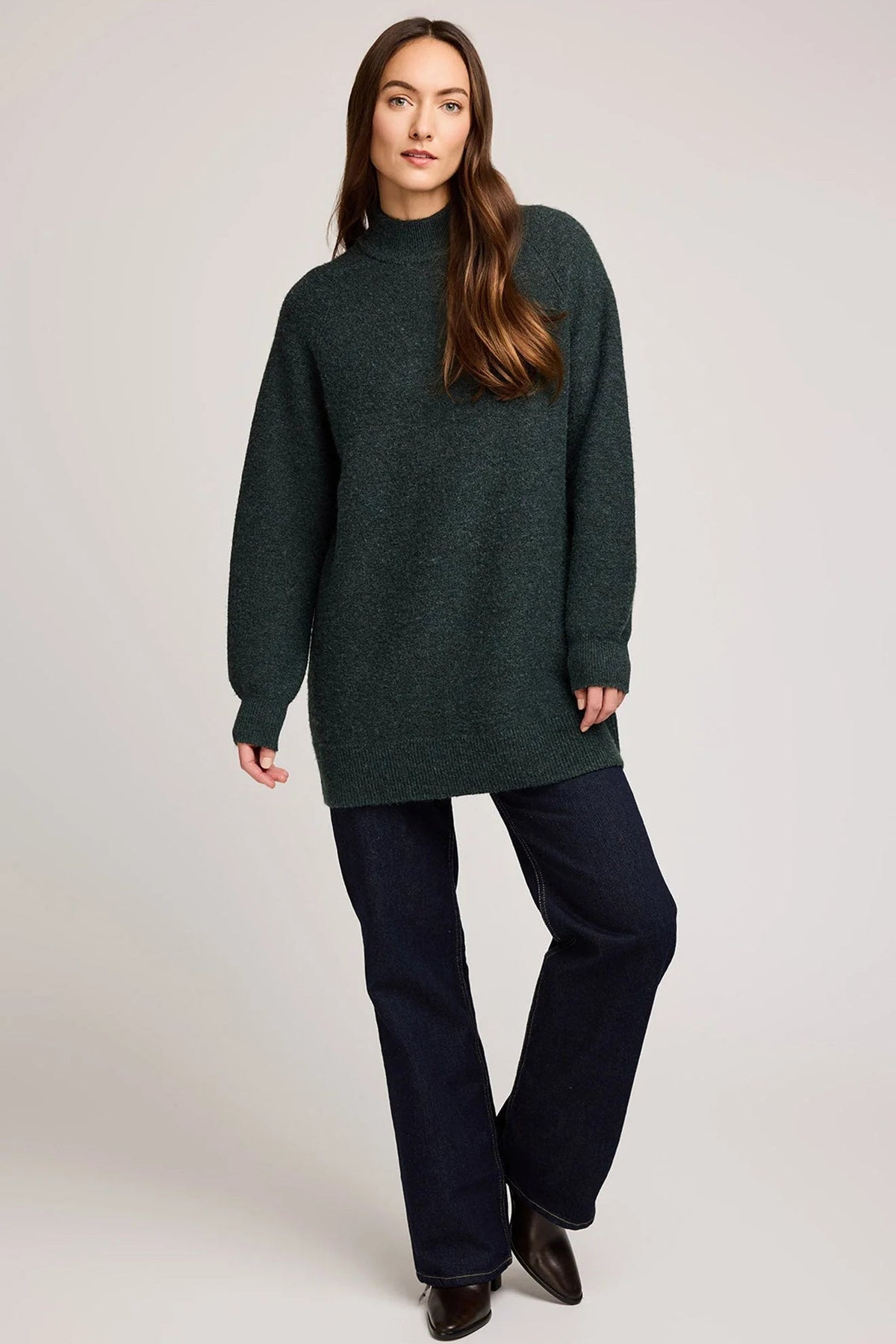 The Lena sweater is made of a soft yarn in a textured horizontal stitch pattern. Features include a mock neckline and exposed center back seam detail.