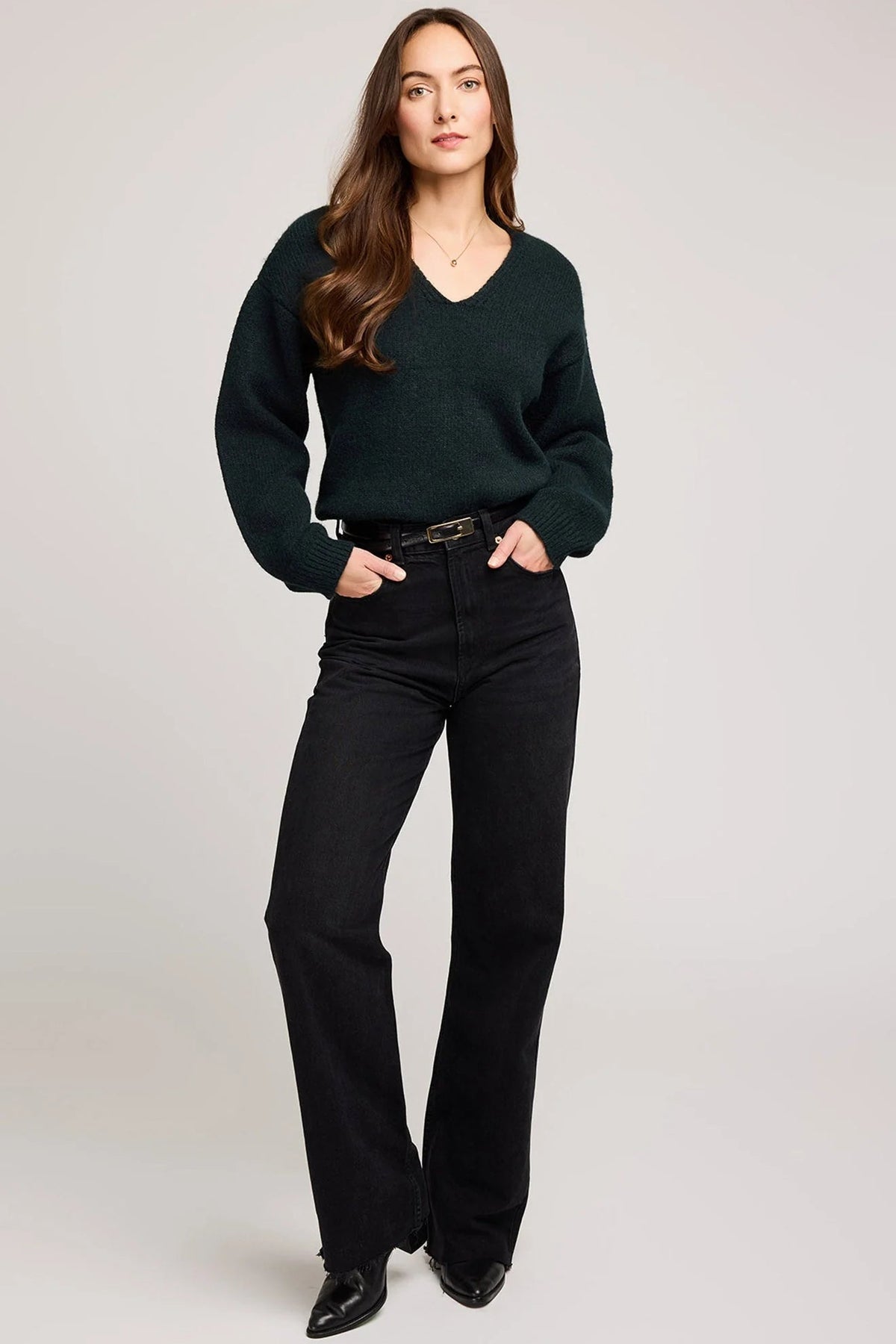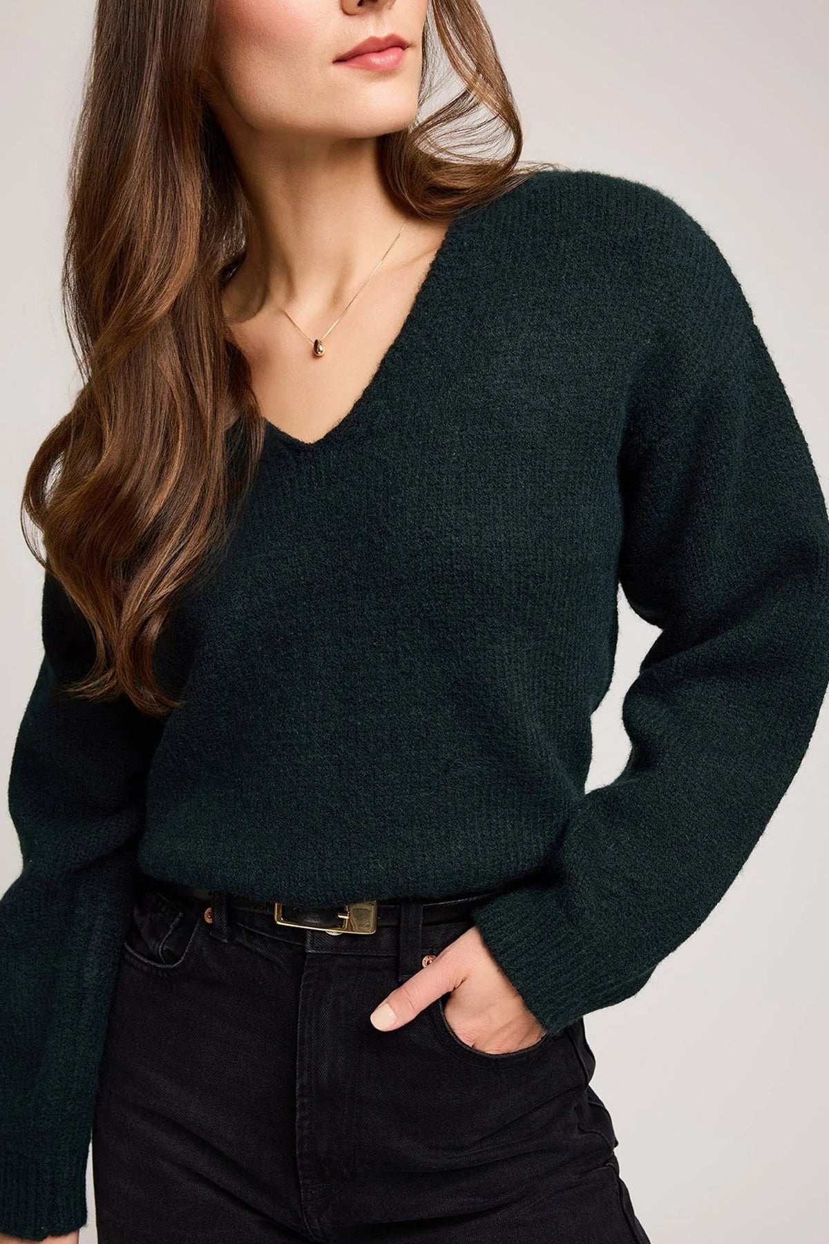 The Angelica sweater is made of a soft yarn in a jersey stitch pattern. Features include a v-neckline and rib along the sleeve and body hem.