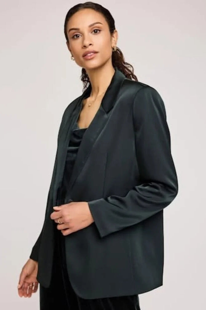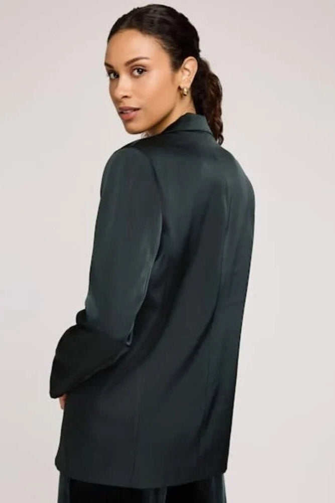 Add a touch of flair with the Dione Blazer, featuring a smooth satin feel in a stunning dark green shade. Perfect for holiday gatherings, its sleek texture and rich color will keep you shining all season long.