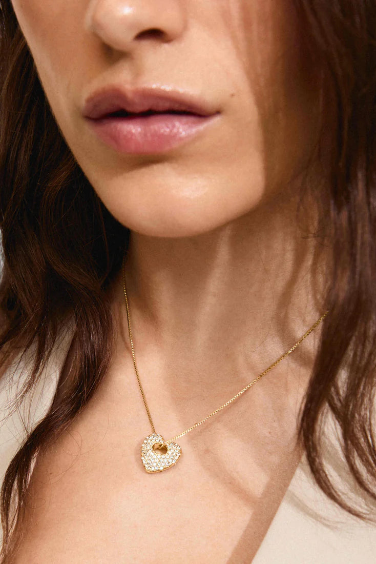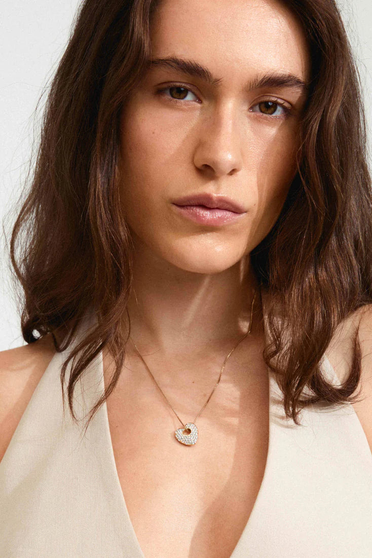 Love of dunes! Gold-plated or silver-plated DUNE necklace from Pilgrim's IMAGINATION collection. A slim box chain with a cute heart pendant, decorated with sparkling Preciosa crystals that add a touch of glam to your everyday styles. Wear it solo for a romantic statement, or layer up with multiple chains for a personalised stacked look. Let your heart lead you to new dreams and adventures while enjoying a necklace crafted from 91% recycled materials, with care for our planet.