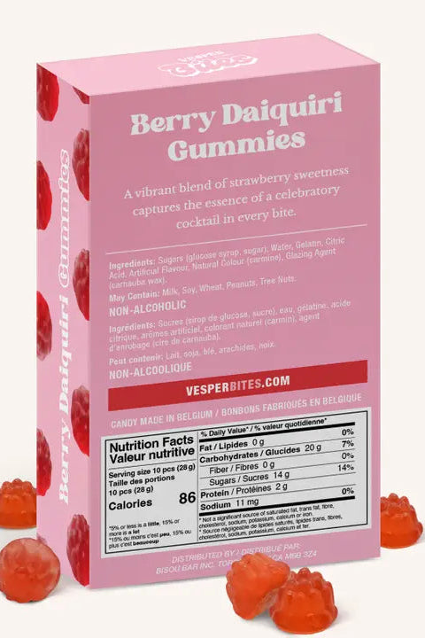 These cocktail-inspired gummies feature a vibrant blend of juicy strawberry sweetness capturing the bright, refreshing flavor of a classic Berry Daiquiri — without the alcohol. With their bold fruit flavor and chewy texture, they’re a standout choice for gourmet candy lovers, cocktail enthusiasts, and unique gift seekers alike.
