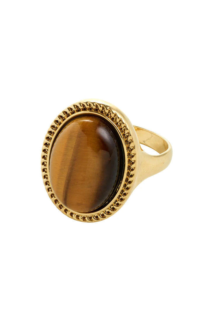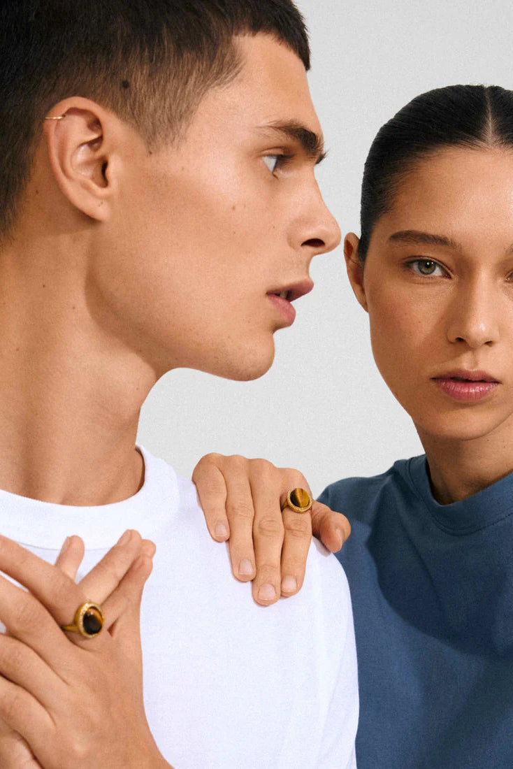 Discover your power in the space between with the gold-plated or silver-plated ring from Pilgrim's BETWEEN collection. An oval cabochon-cut Tiger Eye stone in warm earthy hues, set in an antique-look setting, bestows the ring with a boho chic vibe—perfect for autumn's styles and palette. Classic elegance exudes from this design, ideal for those who favour a unique, vintage-inspired look. The ring is adjustable for perfect comfort and pairs effortlessly with both cosy knits and flowing dresses for an autumnal feel. Crafted from 80% recycled material, with love for our planet.