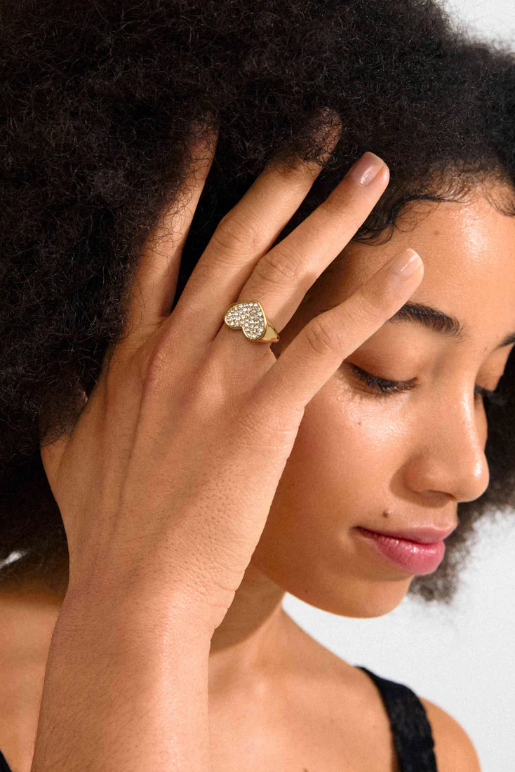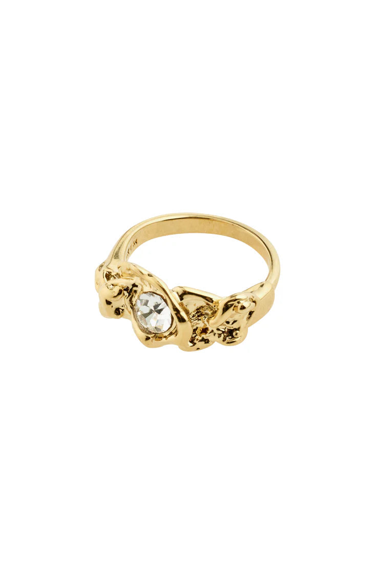 Cherish all shapes of nature with the gold-plated Tina ring, which is part of Pilgrim's recycled collection. This ring is inspired by nature's harmonious and, at the same time, unpredictable shapes, and with the large crystal in the centre of the ring, shine and symmetry are added to the expression. The Tina ring is made from at least 75% recycled materials, with consideration for the environment. Style with basic stack rings and delicate necklaces for a perfect look.