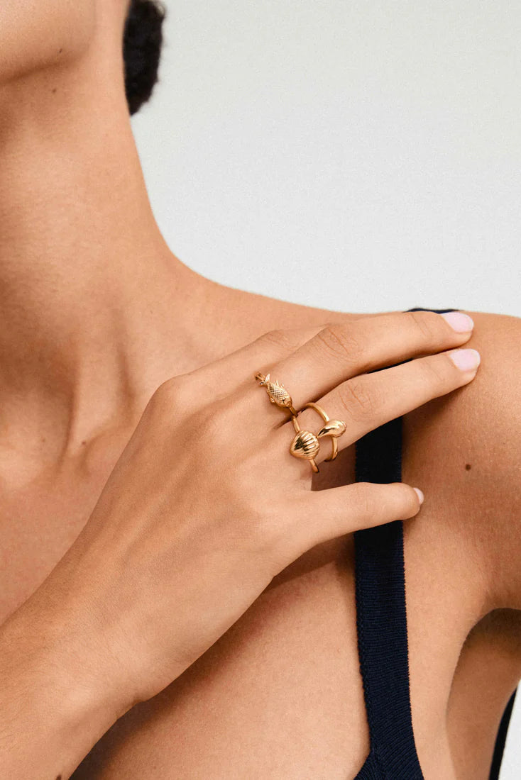A touch of breeze in every look. The BREEZE ring set from Pilgrim consists of three gold-plated or silver-plated rings, crafted to provide you with the ultimate stacked look. Each ring boasts a distinctive charm – a seashell, a conch, and a fish – encapsulating the essence of sun, sand, and tranquil sea waves. Thanks to their adjustable sizes, these rings are easy to customise and style for your summer look. Ideal for infusing beachy vibes into both casual and more sophisticated outfits. Made from 99% recycled materials, enabling you to embrace summer with both style and sustainability.