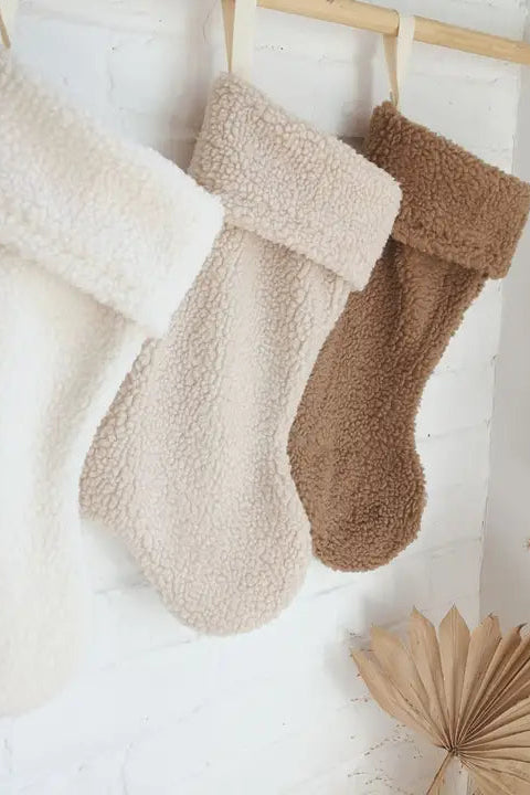 This sherpa Christmas stocking is a neutral, minimalist decoration.