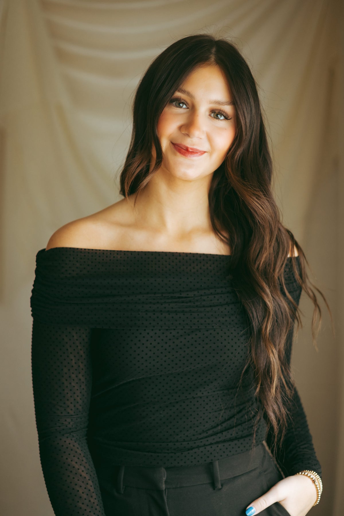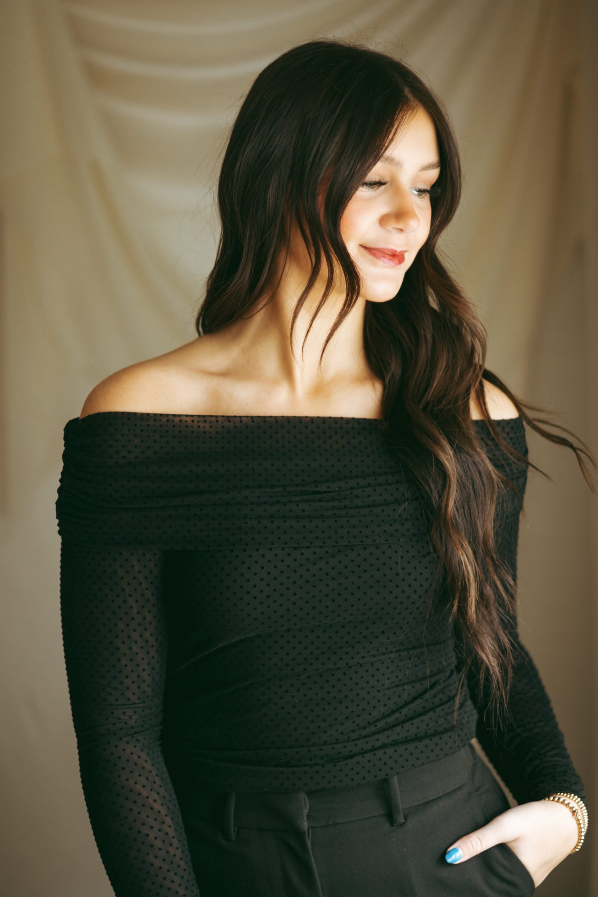 This playful off-the-shoulder top features long sleeves and a fitted silhouette crafted from a soft, lightweight mesh blend of 90% polyester and 10% spandex. With a cozy heavy soft wash, it’s designed to hug you comfortably. The length from shoulder to hem measures 20 1/2".