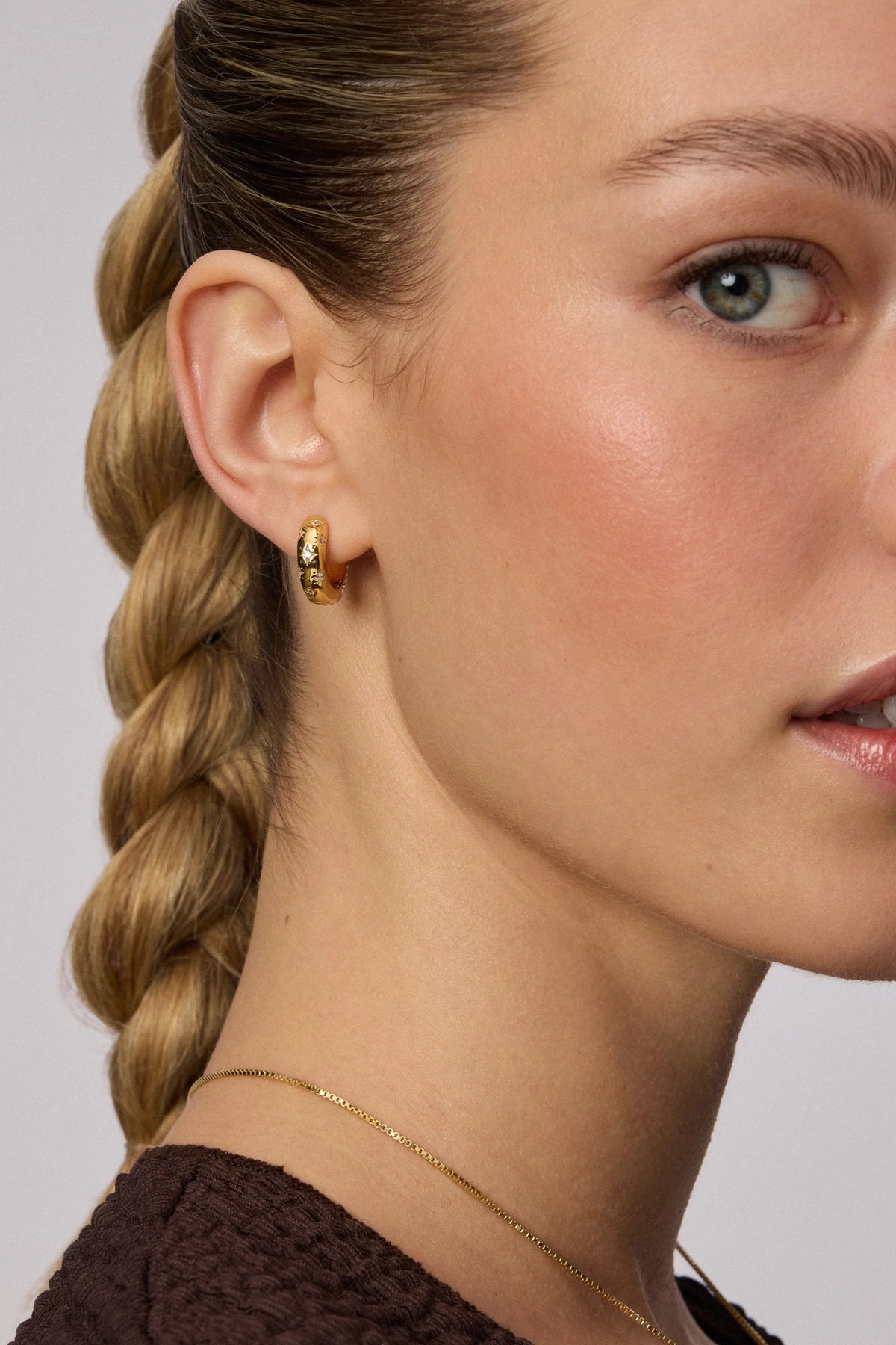 These 16mm reversible hoops deliver double the impact with half the effort. One side features our custom Champagne Sparkle—golden, luminous, and undeniably striking. Flip them over to reveal polished metal etched with radiant crystal starbursts. Lightweight and easy to wear, these hoops offer two elevated looks in one silhouette. Whether you’re dressing for golden hour or a starlit night, these earrings are ready to rise to the occasion.