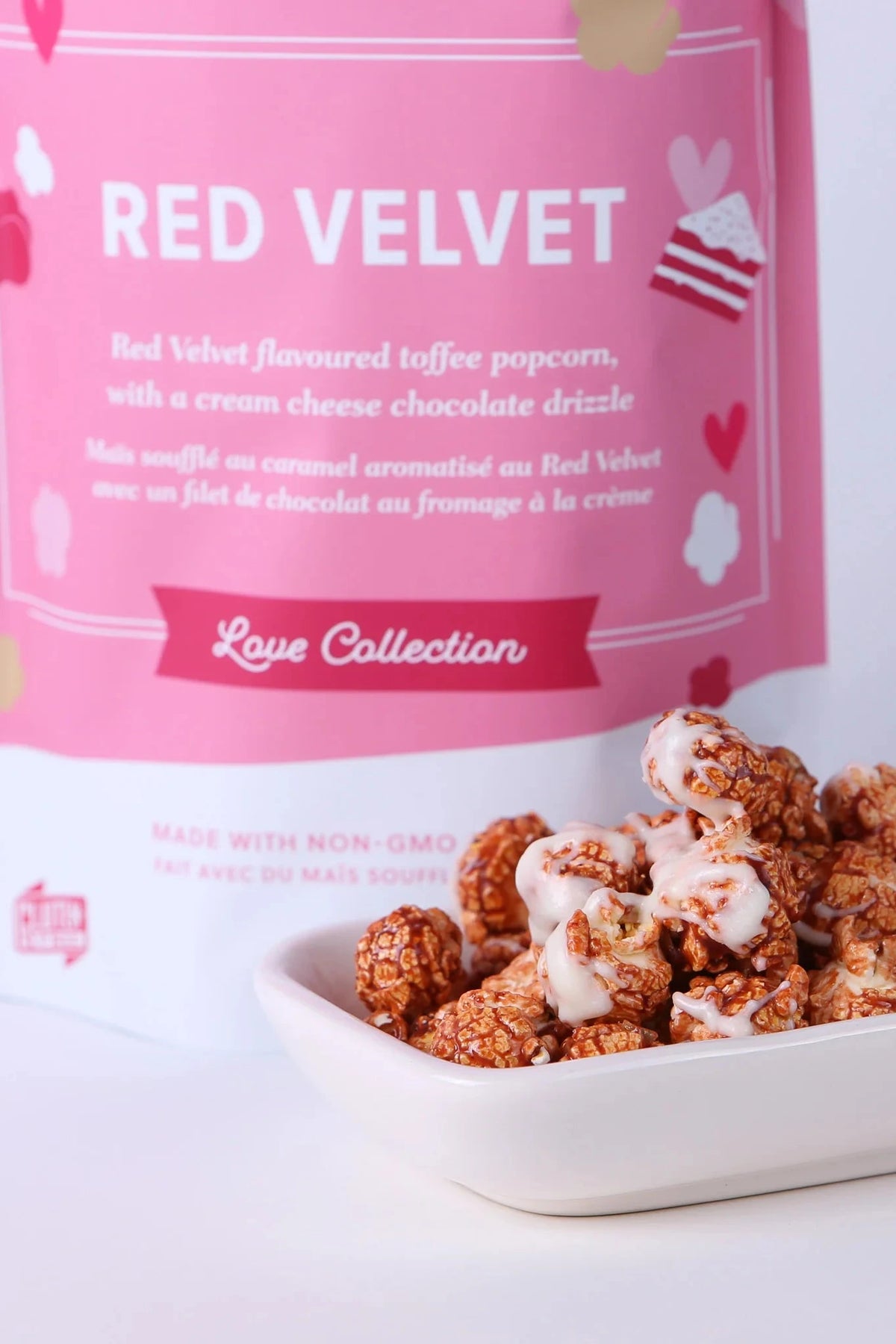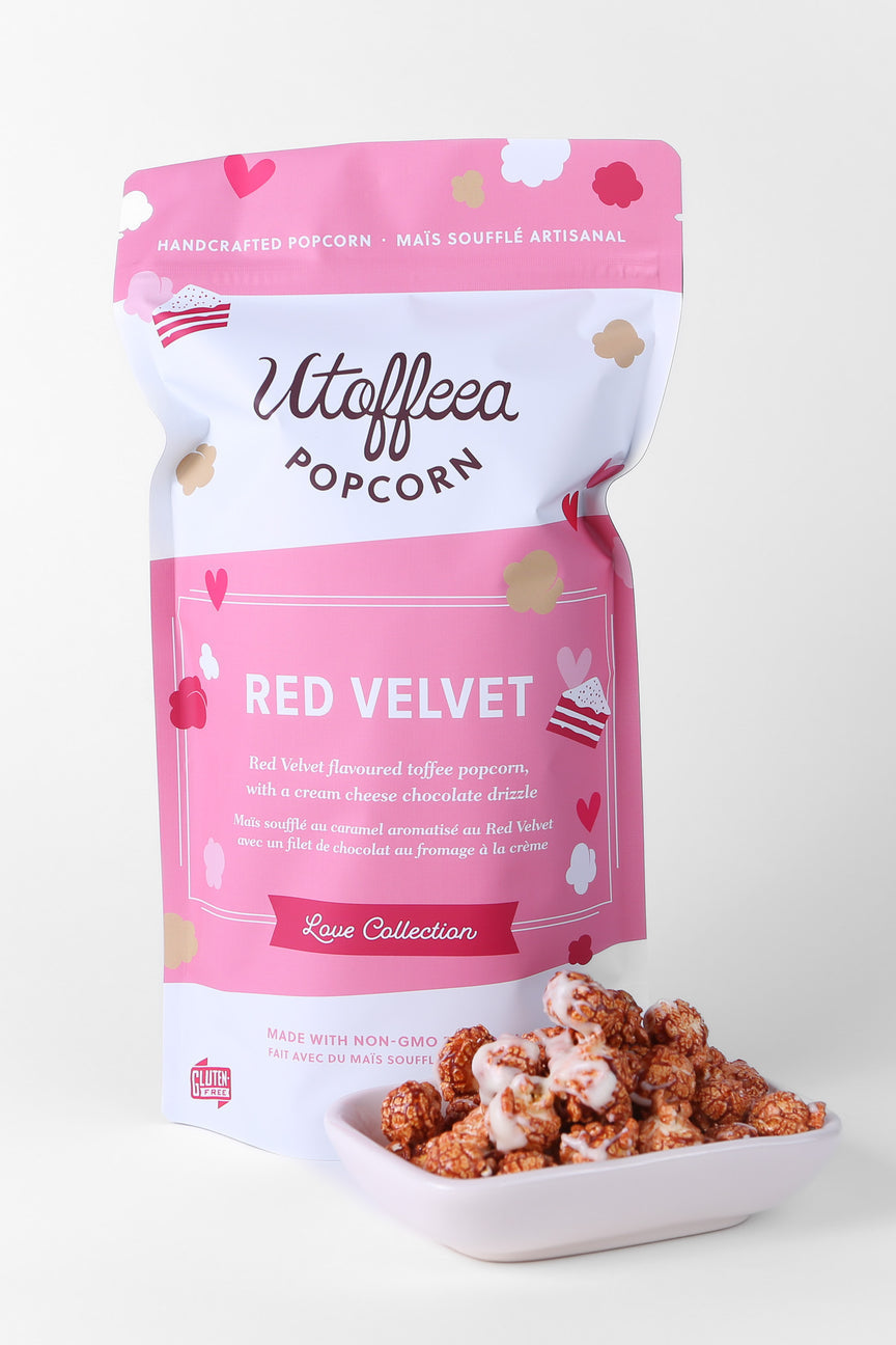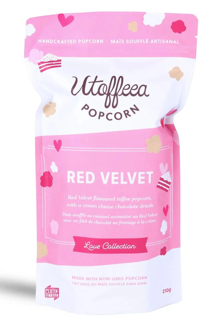 Red Velvet toffee poured over crunchy air popped popcorn, drizzled with white chocolate and lightly flavoured with cream cheese. This popcorn is a FAN FAVOURITE with customers asking for it all year long.