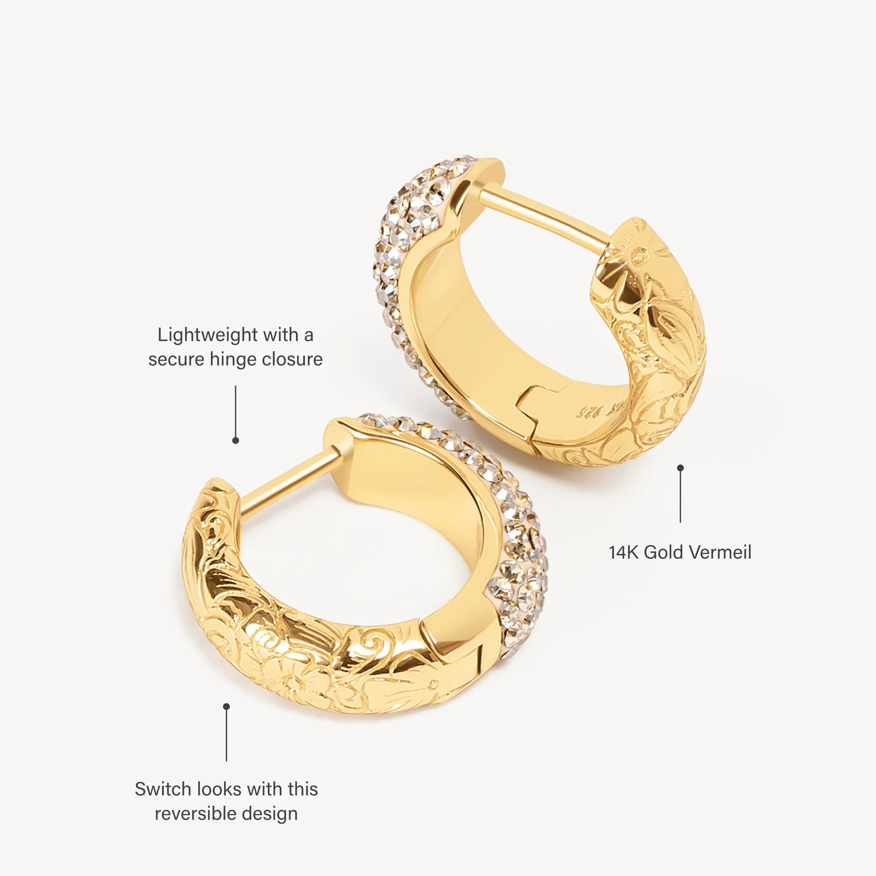 Bloom meets brilliance. The Etched Floral Sparkle Reversible Hoops combine delicate floral metalwork with bold, hand-set crystals for a wearable expression of contrast and charm. One side features intricately etched blooms; the other shines with our signature Sparkle in Soft Gold, White or Rose Gold. At 16mm, these reversible hoops are small enough for everyday and impactful enough to anchor your look. Lightweight, comfortable, and easy to flip depending on your mood—these earrings are seasonless, statement-ready, and made to move with you.