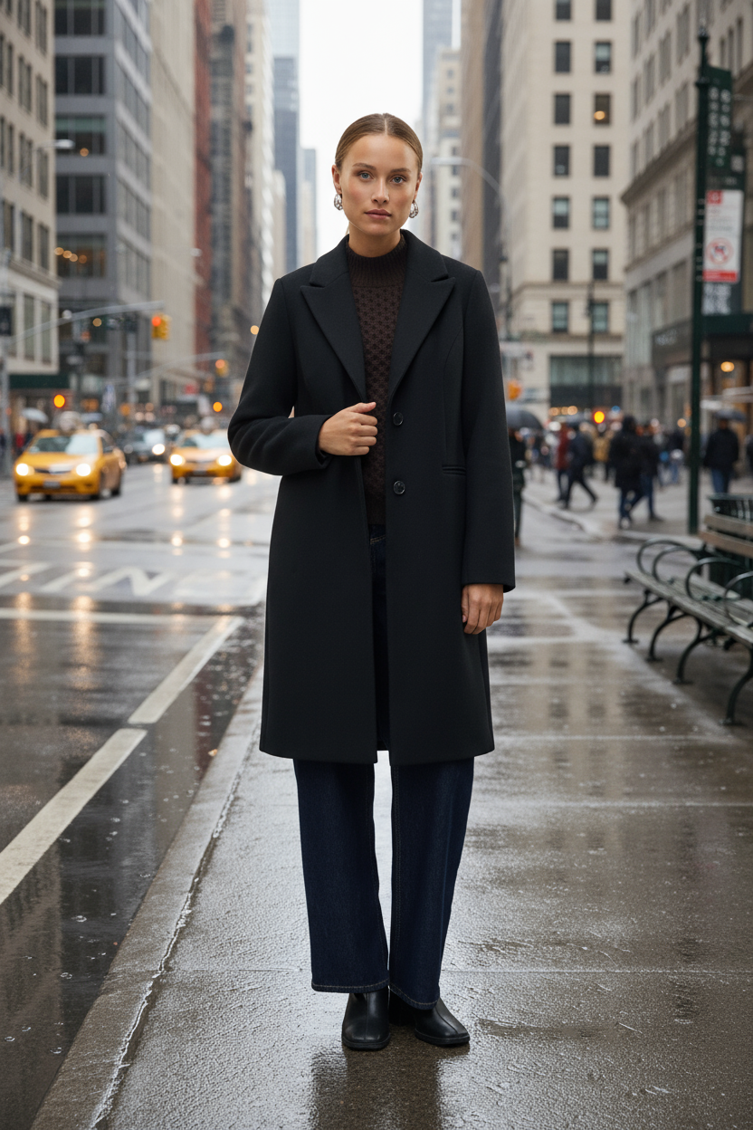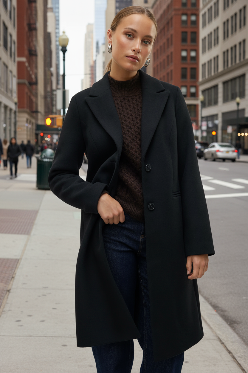 V-neck collared long sleeve coat with a fitted silhouette. This coat hits mid thigh. Wear it open or use the buttons to keep it closed for extra warmth. Pair it with a jeans or a dress in heels for date night. The perfect coat for any occasion.