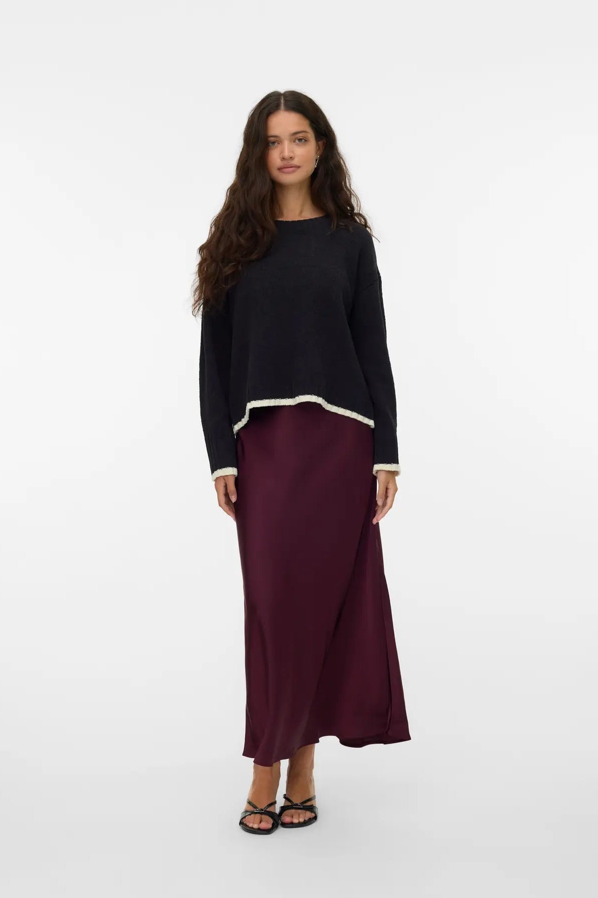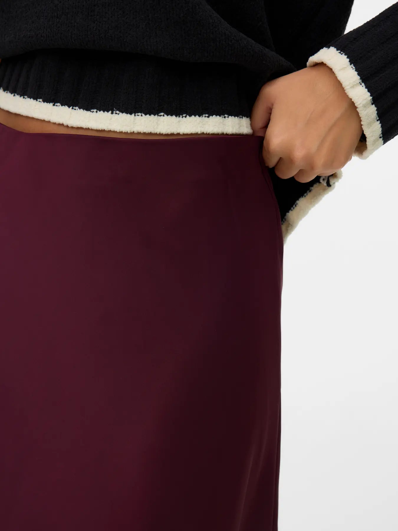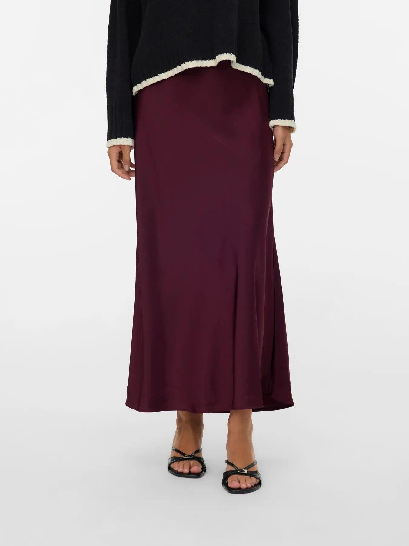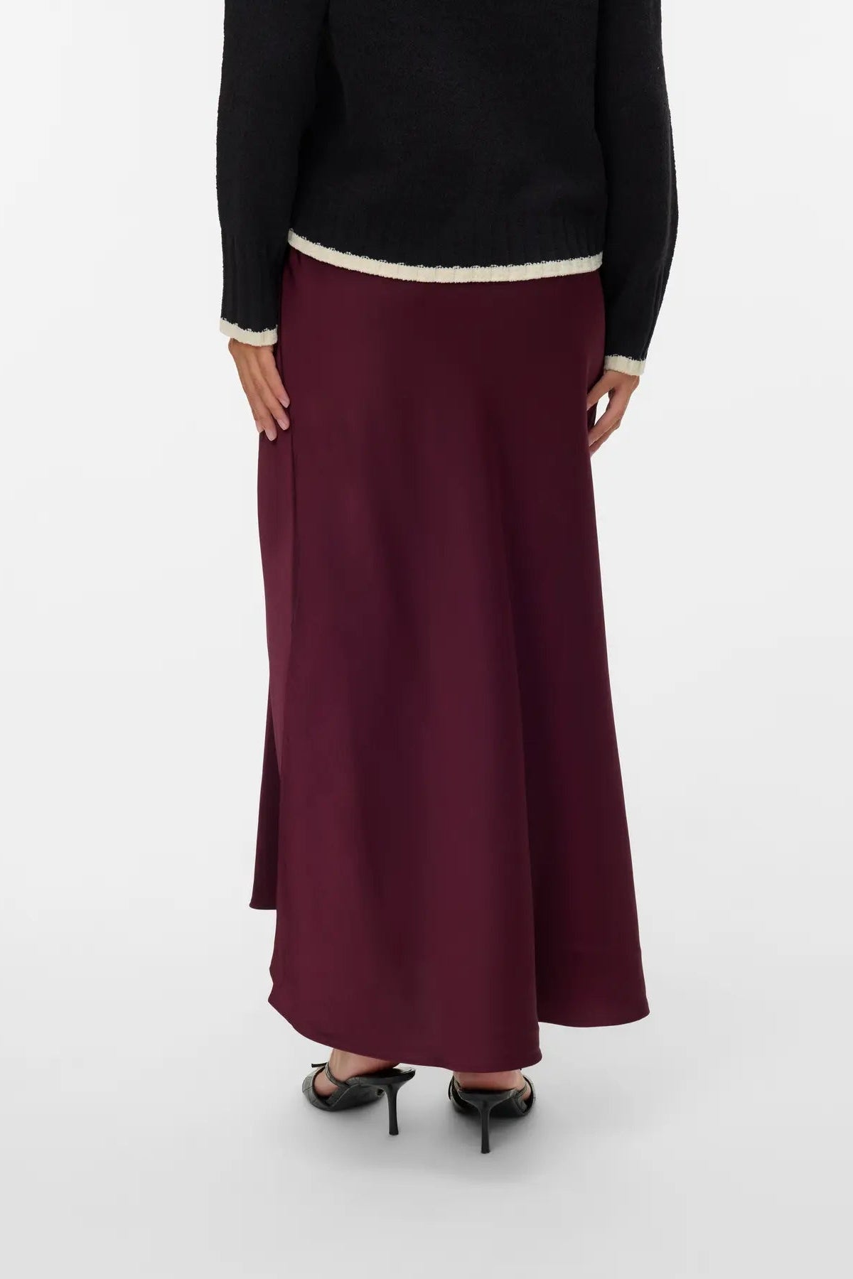 Elevate your wardrobe with the Vero Moda Elena Satin Midi Skirt in Wine. Featuring a high elastic waist for a comfortable, flattering fit, this A-line skirt flows gracefully to create a sophisticated silhouette. Its faux satin fabric adds a subtle sheen, perfect for transitioning from day to evening wear with effortless style.